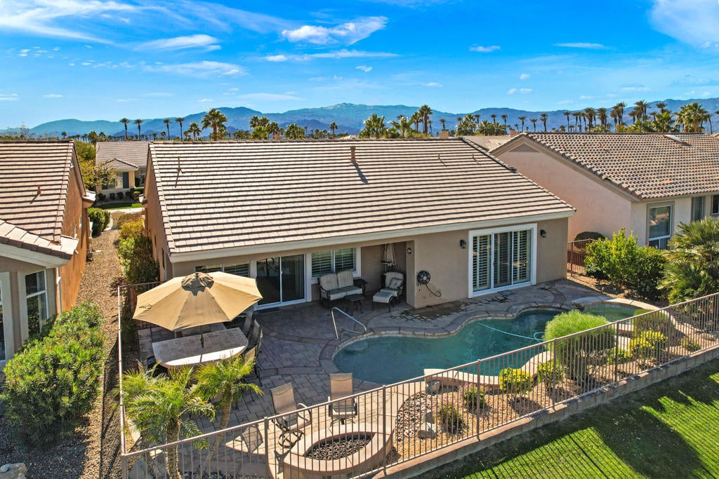 Located in the best 55+, Sun City Palm Desert, This GOLF COURSE St. Croix also has gorgeous mountain views and is the most popular model in the community. The curb appeal is top-notch with newer paint, stack stone wainscot, concrete overlay, and a large gated courtyard. The backyard is fabulous with a sparkling Pebble-Tec POOL AND SPA with a waterfall and Baja bench and comes with a SOLAR system that is owned. There's landscape lighting, a built-in BBQ, a cozy firepit, and beautiful pavers for maximum outdoor enjoyment. Inside there is 16X16 tile and inlaid carpet, built-in media center, plantation shutters, and double doors on the den/office and hobby room. The kitchen has slab granite counters, tumbled marble backsplash, a wine fridge, and LG black stainless appliances, and upgraded cabinets. The primary bedroom has an added custom closet making the bedroom a perfect size and shape. The bathroom has a pocket door, slab granite, and a large walk-in closet. The guest bedroom is adjacent to the full powder bathroom. The extended garage has an epoxy floor, cabinets, a recirculating hot water pump, central vacuum, and there was a new HVAC A/C system installed in 2019. The newer LG washer and dryer are included in the laundry room. Some furnishings are negotialbe outside of escrow. Plan your 4th of July BBQ as this home is perfect for entertaining! 'Buy Where you Love to Play...Sun City Palm Desert!'