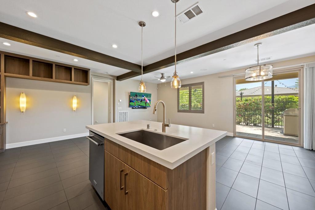 Lock & Leave Desert Retreat...Front & Back Landscaping Included...All Ages Are Welcome to Enjoy This Sunny South Facing Former Model Situated on a Premium Oversized Lot within Walking Distance to the Clubhouse. This Aria Floor Plan with Loft & Finished Den features approx 2,148 Sq. Ft. of Highly Upgraded Custom Appointments. Features include custom entry accent wall, plantation shutters and electric blinds, built-in cabinetry in the great room, upgraded lighting throughout, surround sound speakers, and upgraded tile accents in the kitchen and baths. The great room layout features the primary suite with sliders to the outdoor patio at one end with a guest bedroom and bath at the opposite end of the home. The second level with guest bath is the perfect space for a game room, theatre, or family room. The second level also includes a fully finished den with upgraded carpeting and custom shelving that could easily function as a guest bedroom for visiting friends and family. No surface has gone unnoticed, including the painted garage with epoxy flooring. The garage has been painted and features epoxy flooring. Trilogy Polo Membership is available for transfer. Pristine Clean and Move-In Ready...Don't miss this unique opportunity to own one of Trilogy Polo's finest!