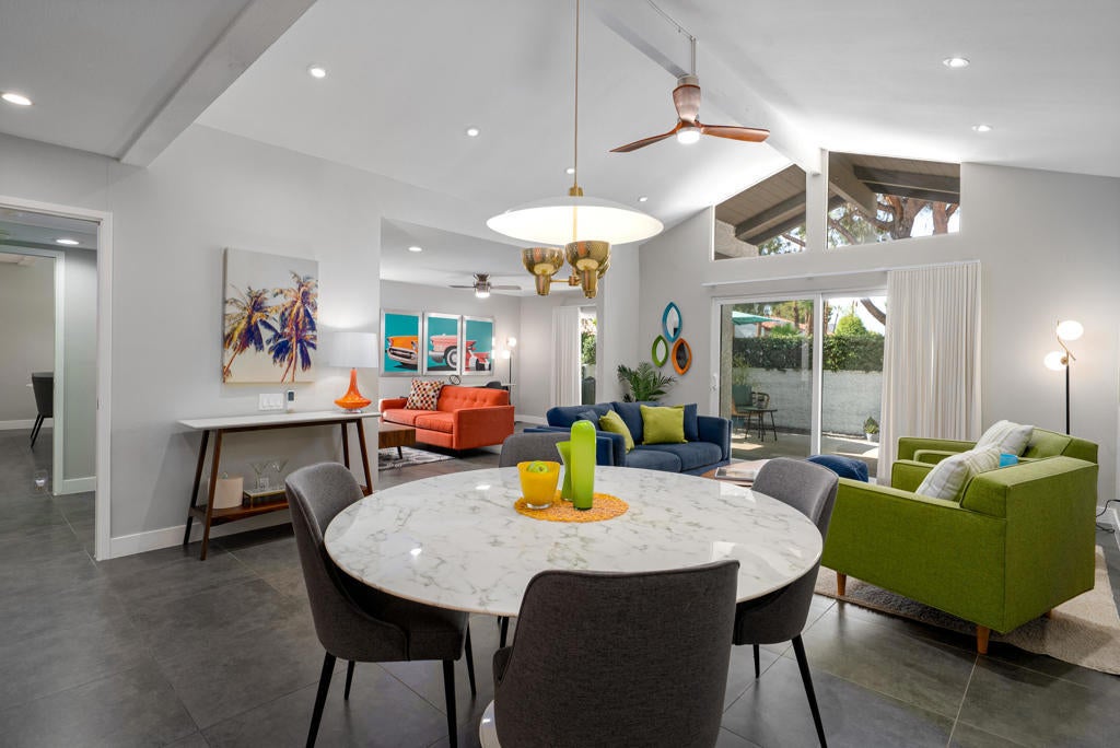 Experience modern desert living in this beautifully updated 3-bedroom, 2-bath villa-style condo, ideally located in the sought-after Indian Canyons neighborhoods of South Palm Springs. Thoughtfully reimagined, one of the bedrooms has been opened up to create a spacious den/TV room, adding to the home's open-concept feel and flow.Soaring 14-foot beamed ceilings and large sliding doors flood the living areas with natural light, providing stunning views of the San Jacinto Mountains. The galley kitchen, stainless steal appliances, artistic tile backsplash, stylish flooring, and remodeled bathrooms provide a turnkey, contemporary feel throughout. The primary suite features a walk-in closet and direct access to a large private patio.Whether you're entertaining indoors or enjoying the outdoors, the expansive patio--with multiple access points--is the perfect space for al fresco dining or relaxing poolside, as this unit is conveniently located just steps from the community pool and spa. Additional highlights include in-unit laundry, updated HVAC, recessed lighting, covered carport parking, and a separate entry den ideal as a remote office or media space.Set within a well-maintained community offering lush landscaping, gated tennis and pickleball courts, and panoramic mountain views, this home is ideal as a primary residence, seasonal retreat, or vacation rental opportunity.