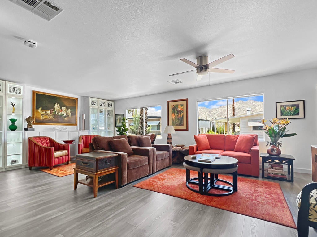 This beautifully updated manufactured home is located on a very quiet street in the picturesque South Palm Desert community of Indian Springs (55+). VIEWS, VIEWS, VIEWS. With virtually no road noise, you can relax on your covered patio with your morning coffee and evening glass of wine while enjoying the sounds of nature and visiting with friendly neighbors. All this beauty and serenity is just 2 short miles up from the renowned El Paseo shopping and dining district. This comfortable home is extremely affordable with LOW SPACE RENT (rent controlled), NO MANDATORY HOA DUES, and NO REAL ESTATE PROPERTY TAXES! Space rent for the new buyer is only $657.22/mo.A major remodel was completed in 2024: All new chef's kitchen with expansive quartz countertops, LG appliances, and an abundance of cabinets and drawers. Gorgeous and durable new grey laminate flooring flows throughout the home and a built-in wall of lighted display cabinets are featured in the living room. The interior is fully drywalled and both the inside and outside were recently painted. You will appreciate the expanded walk-in closet in the main bedroom, 11 foot long pantry, and all new custom 2'' aluminum Bali Blinds. A new Owens Corning shingle roof (with a transferable warranty) was just installed making INSURANCE EASY TO OBTAIN. Also, the plumbing and sewer lines have been replaced.Outside, there is a long covered patio, covered parking, two storage sheds, and a large backyard that could be fenced for privacy or pets.Low monthly space rent in Indian Springs is protected by Rent Control, with water and sewer included. Privately owned park (not Indian Land). No real estate property taxes! The clubhouse, pool & spa, shuffleboard, and greenbelts are included for all residents, and there is a voluntary Social Club HOA if you choose to join. Call your agent today for a showing!