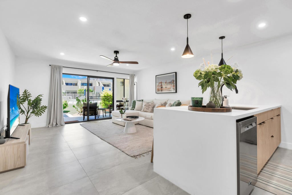 Completely remodeled 1-Bed/1-Bath Condo in the iconic Smoke Tree Racquet Club in South Palm Springs. This ground-level corner unit features a sleek open floor plan with 24x48' porcelain tile throughout. The brand-new chef's kitchen includes custom European cabinetry, white quartz counters, a waterfall island, and Maytag stainless steel appliances--perfect for cooking and entertaining. The spacious bedroom offers an in-closet washer/dryer hookup and ceiling fan. The updated bathroom includes a porcelain and marble tiled shower, European vanity, and modern fixtures. New recessed lighting and fresh paint add to the clean, contemporary look. Enjoy stunning sunset views from your private patio. The community offers resort-style amenities including a pool, spa, and 4 tennis/pickleball courts with mountain views. Conveniently located across from the SmokeTree shopping center (Ralph's, Starbucks, Native Foods, more) and just minutes from downtown Palm Springs. With a low HOA and land lease through 2067, this condo is ideal as a first home, second home, or investment property. This is a must-see unit--designer finishes, modern lighting, and smart layout set it apart from the rest. All furnishings are available outside of escrow. Schedule your showing today!