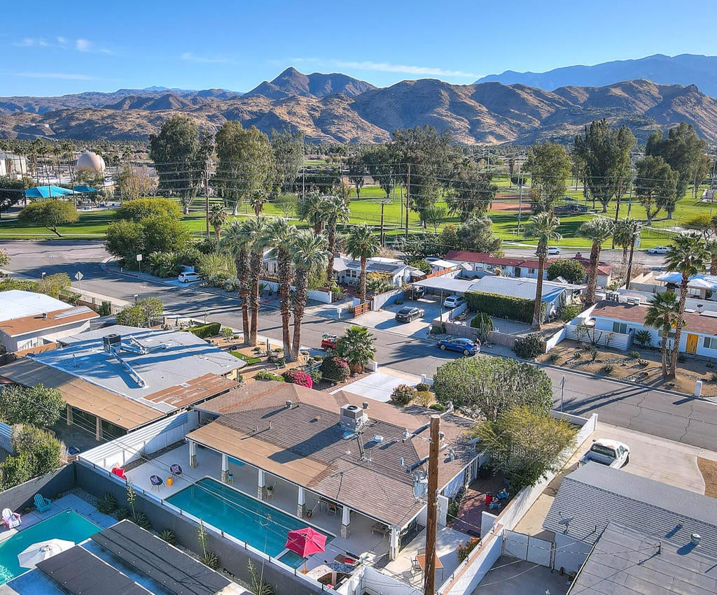 JUST REDUCED. One of the best values in South Palm Springs! 3 bed, 2 bath Demuth Park Cottage in wind-shielded south Palm Springs. Own the land! No HOA! One-Half block from Demuth Park. Enchanting pebble-tech pool and spa. Excellent property for full time living or for investment/airbnb (permits are still available for this neighborhood)--check city website to confirm). Move-in ready or remodel to your taste. 1200 square feet includes a mostly finished space (formally the garage) ideal for a bedroom conversion, office or studio. Some of the photos show furnished rooms but the property is unfurnished and empty.