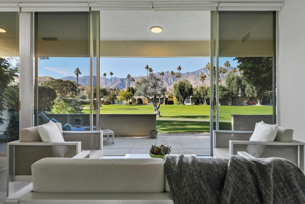 RARE DIRECT WESTERN VIEWS across a fairway to a backdrop of the San Jacinto Mountain Range. Vintage Mid-Century Modern living designed in 1967 by renowned Palm Springs architect Richard Harrison. Experience high ceilings, clean simple lines, bright and airy interiors flooded by an abundance of natural light. Space maximized by both a covered western patio and a large enclosed open eastern courtyard patio with fountain and BBQ. Peaceful interior location within the 120 acres of lush lawns and fairways of the prestigious Seven Lakes Country Club. Refreshed interior includes 2'x 4' tile flooring throughout and updated bathrooms. On the 3rd fairway of a Ted Robinson 18-hole executive golf course. Just steps from one of the expanded poolside pavilions, featuring year-round heated pool, men's & women's shower facilities, outdoor kitchenette, and sauna. Attached private enclosed garage for extra storage accessed from patio walkway with ample guest parking available. Other features include: in-unit laundry, William Cody designed Clubhouse with full service dining room, lounge/bar, and terrace patio overlooking lake, waterfall, and fountain. Tennis/pickleball courts, 15 pools/spas, low density, utilities underground, electric car charging stations, and you OWN the land. This guard-gated community is adjacent to the upscale Parker Hotel. Seven Lakes is a lovely visual masterpiece where you can escape to relax and enjoy the Palm Springs desert lifestyle or create your dream home.