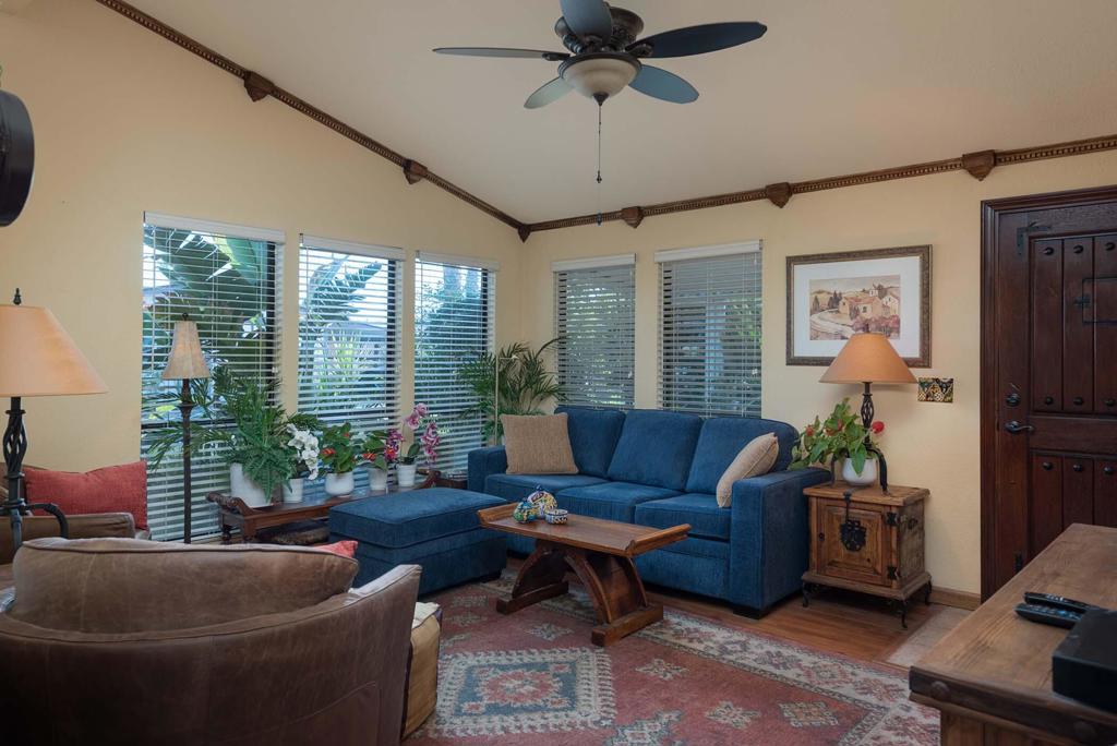 This home is truly one of a kind, as you enter through the tiled patio, you get a flavor of the inside by the Wooden Front Door, as you enter you notice the warmth of the wooden crown molding throughout the entire home. The Spanish style true wooden furniture and decorative festive pottery will have you ready for Margarita's and Relaxation. This 2BD/2BA home has 1140 sq feet. The front living room and front loaded kitchen look out onto the lush tropical landscape. This home is sold completely furnished and ready for move in. The Hallway Bath has a step in shower and is convenient to the guest bedroom. There is a full sized Washer/Dryer behind folding closet doors. The Large Primary Suite has a full wall closet and dual sinks with both soaking tub and step in shower. The Kitchen features white appliances with Stove, Refrigerator and counter-top Microwave. The Dining Room table is Solid Wood and has 6 chairs for serving dinner with guests. The upgraded Dual Pane Sliding Door with built in blinds leads you to the carport sitting area with green plants and warm decorative art. The opposite side patio is private with mature landscaping and a wonderful fountain for entertainment or afternoon reading enjoyment. There is a large walk in storage shed, with tile floor and hot & cold water. This home has a newer A/C System, and has been well maintained and updated nicely. The Canyon is centrally located in the Valley and has easy Freeway access on Gene Autry Trail or Date Palm Dr. We are near shopping, entertainment, PS Int'l Airport and 10-12 Min. to Downtown Palm Springs! The Canyon features only Full-Time Residence or Second Homes. We have wonderful park like greenbelt grounds with Tennis & Pickleball. Our clubhouse boasts an upgraded Banquet Hall, Gym, Card Room and Library along with 4 Enclosed Heated and Cooled Shuffleboard Lanes, Two pools and a Spa. You will need to qualify as a resident with 3 times space rent $950 = $2850 along with a FICO score of 750. One domestic animal of 20 lbs unless it is a Service Dog. The Canyon is the place to be for 55+ Adult Lifestyle Living. Make an OFFER Today!!