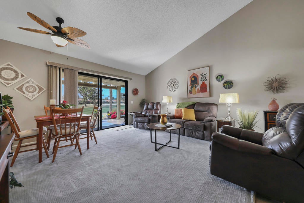 LOOKING FOR VIEWS ON THE GOLF COURSE? THIS IS IT Sensational Golf Course and Snow Capped Mountain Views from a tastefully updated Vintage unit. The SUNNY SOUTH/WEST facing elongated patio is BRAND NEW and is bordered by artistically designed landscaping of beautiful plants and stones. The kitchen features Stainless Steel appliances and this unit's open concept kitchen/ living/ dining spaces are anchored by an attractive island. The 2 bedrooms, located on either side of the living area are separate worlds unto themselves. Walk-in closets in both the primary bedroom suite and 2nd bedroom provide plenty of storage. Laundry machines are situated inside for maximum convenience. NEW HVAC compressor. 2 car side by side parking, 1 under the carport, 1 next to it. Easy in and out access as Preston Trail is the first street from the main gate. Great opportunity to enjoy resort-like living, in a secure guard gated community offering fun events, plenty of sports: golf, tennis, pickle ball, bocce ball, biking, walking, plus 20 swimming pools, active clubhouse. Pet friendly. Short terms leases allowed. Turnkey, including 3 BIG SREENS! GREAT VALUE. A GREAT DEAL!
