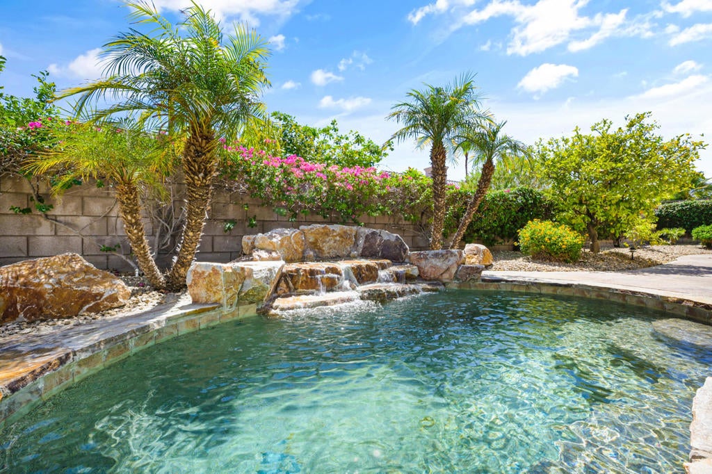 Welcome to this St. Croix floor plan offering 2,032 sq ft (EST.) of well-designed living space in the premier 55+ community of Sun City Palm Desert. This residence blends comfort, functionality, and resort-style amenities--ideal for year-round living or a seasonal desert retreat. Inside, you'll find an inviting open layout with tile flooring throughout the main living areas, creating a seamless flow between spaces. The spacious living and dining combo is filled with natural light and provides a welcoming setting for both relaxation and entertaining. The adjacent kitchen features granite countertops, stainless steel appliances, a gas range, ample cabinetry, and a charming breakfast nook framed by windows. The primary suite is a peaceful retreat with plush carpeting and natural light with an ensuite bath offering dual sinks, a soaking tub, a glass-enclosed shower, and a large walk-in closet with custom built-ins. Guests will enjoy their own private bedroom and full bathroom with a step-in shower. A versatile den/office with bonus room adds flexibility for work, hobbies, or additional sleeping space. Practical touches include a dedicated laundry room with cabinets and sink, and an oversized 2-car plus golf cart garage with built-in cabinetry and epoxy-style flooring. Step outside to your private backyard oasis featuring a covered patio with a ceiling fan, a SPOOL with tranquil rock waterfall, and low-maintenance desert landscaping accented by palms and flowering plants. It's the perfect setting to relax or entertain in style. As a resident of Sun City Palm Desert, you'll enjoy access to two championship golf courses, three clubhouses, two fitness centers, an indoor pool and outdoor pools, pickleball and tennis courts, and a vibrant social calendar. Don't miss the opportunity to make 78295 Griffin Dr your desert dream home!