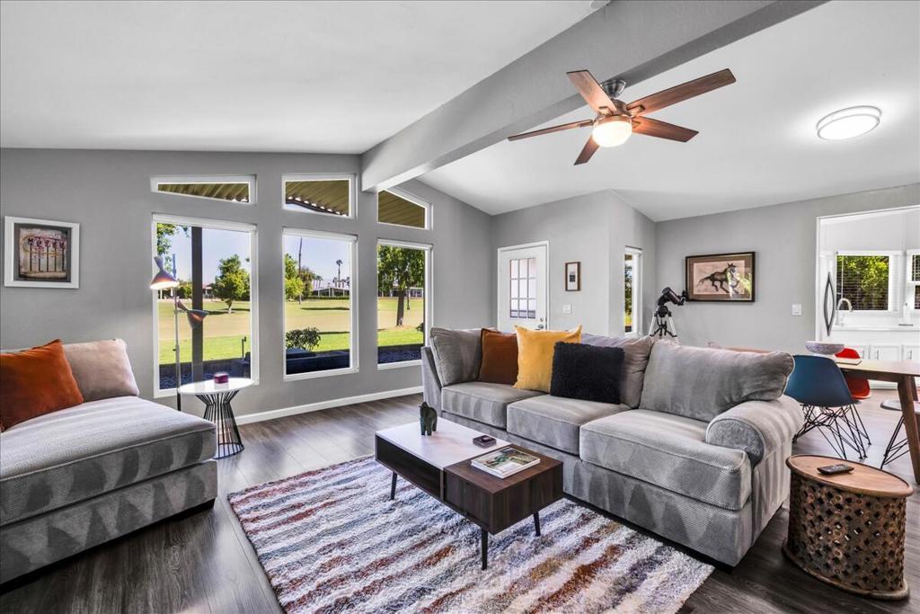 This beautifully updated home features 2 bedrooms, 2 baths and den in 1692 square feet. The open plan public rooms have vaulted ceilings, clerestory windows, a large entertainer's eat-in kitchen, custom window treatments and all stainless kitchen appliances. Large, clean-as-a-whistle bathrooms, an in-house laundry room, three covered parking spaces and a large storage shed add exceptional value to this home. Good quality laminate flooring throughout. This Light, bright and airy home is offered turn-key-furnished and move-in ready. Lively Adult Living in Suncrest Country Club - 55+ Community, inviting FAIRWAY residence situated in this vibrant community in the heart of Palm Desert . Suncrest offers an array of premium amenities including a beautifully maintained 9 hole regulation golf course, tennis courts, pickleball, a putting green, billiards room, community library, welcoming cafe, and a fully stocked pro shop--this community caters to an active and social lifestyle. There is no HOA. The lease is $1,099 per month BUYER MUST GET PARK APPROVAL.