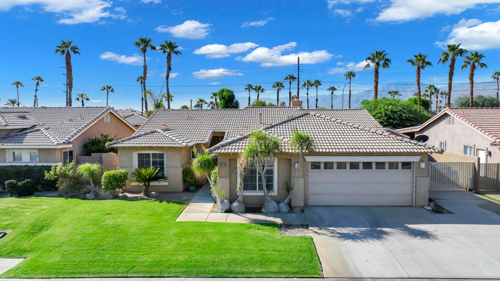Sold turnkey and ready to enjoy! This south-facing home offers unobstructed Santa Rosa Mountain views and a prime central location in west Indio, right on the La Quinta border. Easy access to the freeway, Hwy 111, and Fred Waring puts the entire valley within minutes. Inside, you'll find an open kitchen with a large quartz island, abundant cabinetry, and a gas stove. The spacious primary suite opens directly to the backyard, with a bathroom featuring a double vanity. Highlights include a stunning stonework fireplace, tankless water heater, water softener, and included storage shed. The backyard is expansive and private despite its convenient location--perfect for soaking in those breathtaking mountain views. Walking distance to coffee shops and grocery stores.