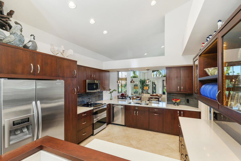 You won't want to miss this impeccably maintained, highly upgraded two-bedroom + Den, three-bathroom Dallas model. High vaulted ceilings with transom windows creates an open and airy atmosphere, with golf course views easily enjoyed from the main living areas. The open floorplan of almost 2,300 SqFt features two primary bedrooms, with a den that could be easily converted to a third bedroom. Floor to ceiling decor lighting creates a warm ambiance to highlight the custom millwork. Loads of seating with front and back patios. Expansive upper and lower conversation areas, showcase the mountain and distant water feature views from the golf course patio off the living room. While the sunny, tiled front courtyard is a private outdoor entertaining space, complete with built-in BBQ. There is direct access to the garage from the front courtyard and the house. The upgraded finishings extend into the oversized 2 car + golf cart garage with built in cabinets. This home comes TURNKEY FURNISHED with designer furnishings, allowing for a seamless move-in experience. Golf cart included!! The Lakes Country Club offers several dining options, 27 holes of golf, tennis, pickleball and 44 swimming pools located conveniently throughout the private guard-gated community.