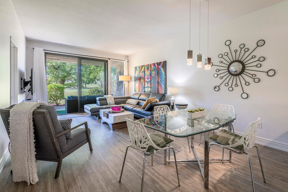 Welcome to this nicely updated condo in the very desirable and well located community of Sunrise Alejo. Unbeatable value on Fee Land (no lease) in low density community of single level garden villa homes with garage. Situated on a quiet cul-de-sac, this 2 bedroom 2 bath condo features an open floor plan with luxury vinyl flooring throughout, a well appointed kitchen and beautifully updated bathrooms. There is a private entry courtyard to enjoy and a back patio on the greenbelt to relax and take in the magnificent mountain views. Spacious primary retreat with gorgeous ensuite and walk-in shower opens to the patio and view. The guest bedroom is well separated for privacy and hall bath is adjacent for convenience. Enjoy resort style living with the 3 pools/spas, tennis/pickleball courts, and lush landscaping. And so close to all the restaurants, shopping and entertainment in downtown Palm Springs. Makes a perfect full time residence, vacation getaway or investment property. Don't miss out on this exceptional opportunity... schedule your showing today!