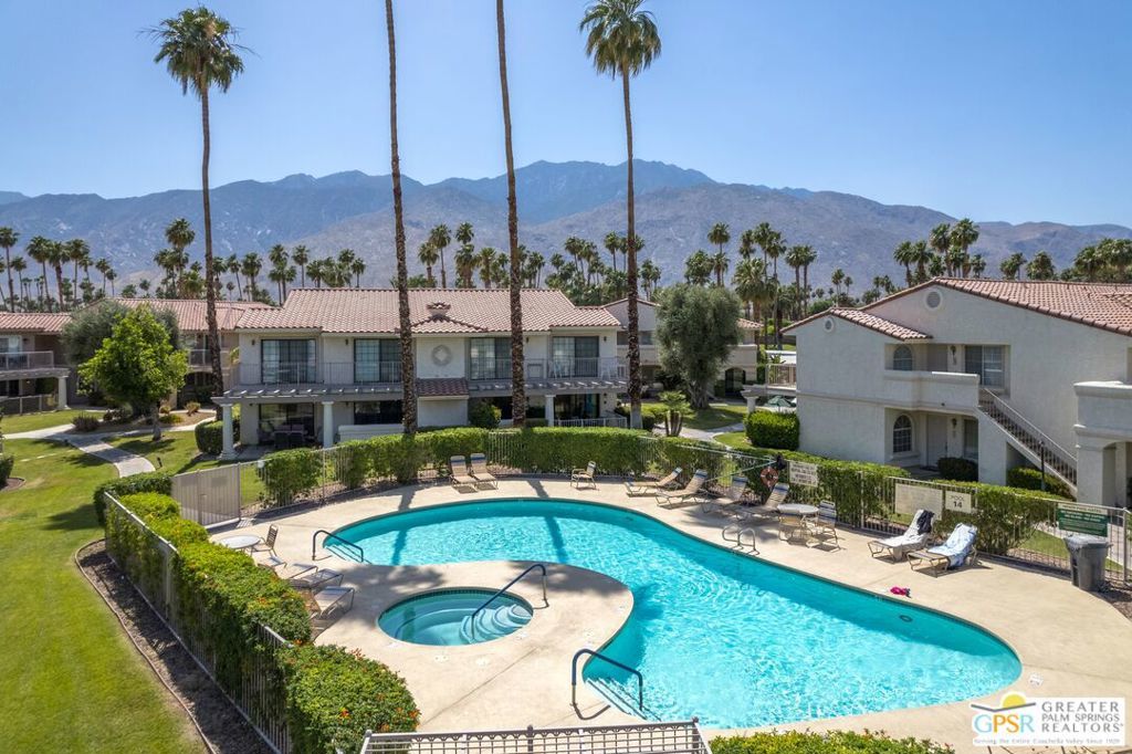 CORNER (end unit), UPPER 2BD/2BA surrounded by beautiful views of MOUNTAINS, lots of grassy greenbelt, & pool (but not on top of it)! Located in the inner circle (no street noise) of the popular Phase 4, which is totally GATED COMMUNITY on FEE LAND (land that you own), of the lushly landscaped Mesquite Country Club, in the South end of Palm Springs! Very cozy & homey condo for your comfort of a main home, or an investment! OPEN FLOOR PLAN! New striking kitchen w/all newer appliances & lighting! Master bath has newer double sinks, quartz counter tops w/newer cabinetry & lighting! Good separation of bedrooms & baths! Guest bath also has newer lighting, sink, & cabinetry! Plush carpet in bedrooms, the rest is tile flooring! VAULTED CEILINGS! Turnkey furnished with quality furnishings (with everything you will need, & more)! Shows LIGHT & BRIGHT! Balconies off the living room & bedrooms for your relaxation & enjoyment of incredible sunrises & sunsets! Close to the famous Village of Palm Springs, shopping, restaurants, theatre, library, senior center, churches, & airport! HOA includes, water, trash, cable TV, internet, garbage, roofs, grounds, security gates, etc.! Absolutely ready to move into!