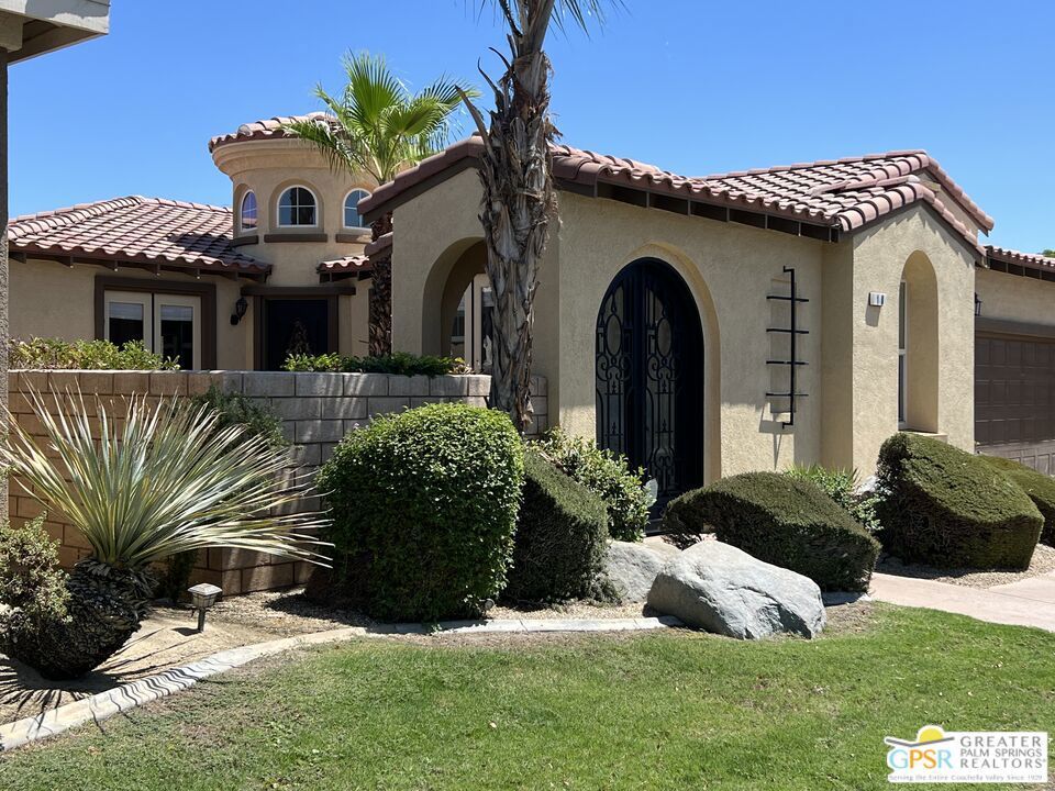 Looking at the custom iron entrance gates of this former model home in Mission Shores, Rancho Mirage will make you fall in love! The 3 bedroom 3 bath home has been thoughtfully renovated within the last year. Updated paint, luxury vinyl flooring, and hardware was replaced throughout the home, while high end accents and designer tiles complete the sophisticated, remodeled bathrooms! The dream kitchen with eating nook offers an impressive amount of storage, and the abundant work surface boasts durable quartz countertops. A massive island with custom waterfall edge is the focal point, while the high end Kitchen Aid appliance suite completes the look. The great room with gas fireplace flows right off the kitchen and is a wonderful space in which to relax with family, or entertain friends. You may wish to reserve the dining room for special occasions. The spacious primary bedroom is a true retreat. Attention to detail is evident in its spa inspired en suite featuring dual vanities, lit mirrors, a luxurious soaking tub, amazing custom shower, and dual walk in closets, with its own backyard access. The second bedroom, which was remodeled into an office, features custom built-ins, while the third casita-like bedroom has a private entrance and full en suite showcasing a designer tiled shower with custom glass enclosure. The third guest bathroom also features high end shower finishes, fixtures, and custom glass. The outdoor entertaining area echoes the homes thoughtful interior with features including covered seating area and built in grilling station with prep sink. You will especially enjoy the heated saltwater pool and spa with dramatic cascading waterfall. The designated laundry room has a wash sink and ample cabinetry, and the washer and dryer remain with the home! The 2 car garage continues the trend with two walls of storage cabinets perfect for your out of season items. This home offers so much for any buyer. The low HOA's, and fee simple land promote ease of ownership, and it's all topped off with OWNED SOLAR for massive savings on utilities. Mission Shores, just off Dinah Shore in Rancho Mirage is just minutes from Palm Springs and the new Acrisure Arena. The many features listed above are but a few reasons to love this home. This is a spectacular offering in a wonderful location. Don't miss out on this opportunity, call to schedule your viewing today!