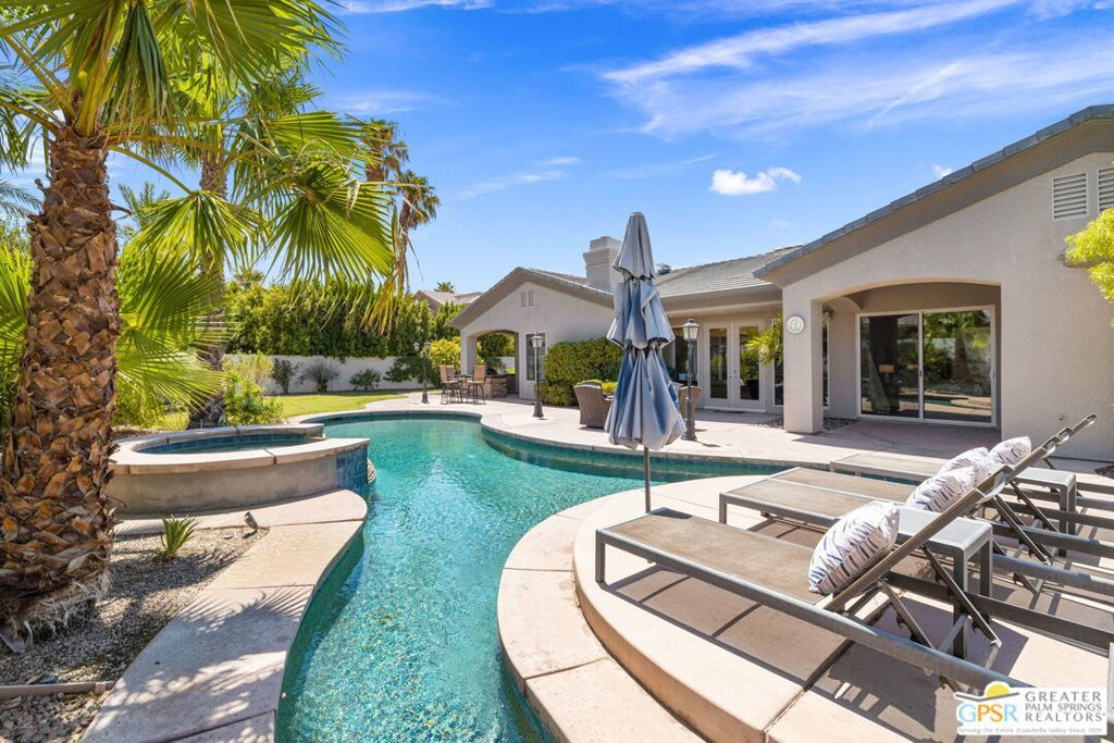 WOW! Check out this fantastic 4-bedroom 3-bath contemporary with 3,789 square-feet. Gated Versailles off Gerald Ford Drive in Rancho Mirage delivers so much of what we LOVE about desert living. This large, beautifully landscaped lot is a bit tucked away and positioned on a cul-de-sac. Once past the gated courtyard and double door entry with clerestory window overhead, you'll appreciate the mix of formal and informal living areas. Indoor-outdoor flow and natural light are themes throughout this impressive property. Take the Matterport VIRTUAL TOUR for a better sense of flow. French doors in the living room open things up beautifully to the expansive patio and a handsome built-in buffet and four skylights are highlights of the dining room. Both the family room with fireplace and breakfast room are positioned adjacent to the updated chef's kitchen with stylish tile and quartz finishes. The outdoor built-in barbecue is an extension of the kitchen and has its own sink. The nearby pebble-finished pool and spa with waterfall is framed by a series of conversation areas and takes center stage out back. The absence of power lines is always a good thing! Mountain views too. Mature landscaping surrounds and includes a mix of palms and plumeria. Onto the Primary Ensuite Retreat with fireplace and office area which features direct patio access. Dual vanities, separate tub and shower, and large walk-in closet with built-ins. Junior Ensuite Two features a bay window with built-ins, walk-in closet, and walk-in shower. Guest Bedroom Three continues the bay window theme and shares a hall bath with Guest Bedroom Four. This hallway features a series of skylights. A powder bath and laundry room with utility sink are located off the kitchen. There is also direct access to the 3-car garage. Proximity to I-10, commercial areas along Monterey Avenue, and the best of Rancho Mirage are more of what we LOVE about this location. El Paseo is also a short hop away. LOW HOA fees and quality of life it all adds up. Take a closer look at 8 Moet Court in Rancho Mirage!