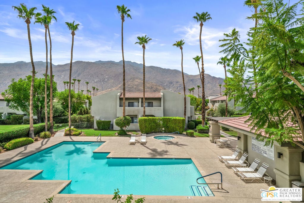 Welcome to Casa Verde, a private gated condominium community in the heart of everything that is Palm Springs! Location Location, Location!!! This upgraded top floor unit has one of the best views in the entire community. The primary bedroom balcony has stunning views of Mt. San Jacinto and overlooks a beautiful community pool. Upgrades include: Luxury Vinyl Tile flooring throughout, remodeled kitchen with stainless steel appliances, double sink, and full size stacked Washer Dryer! Travertine custom shower. This unit was used as a vacation home and occasional rental. Minimum rental period is 30 Days per HOA rules. The community has 2 resort style pools with their own spas, 2 tennis courts and a putting green. 1 assigned covered carport space come with the unit. Casa Verde is right near the convention center and just a few blocks to downtown, restaurants, movie theaters, and all the fun that is Palm Springs. This unit comes fully furnished including dinnerware, bedding. Just bring your clothes and groceries and begin enjoying your new life, or future vacation home. LOW HOA!!!