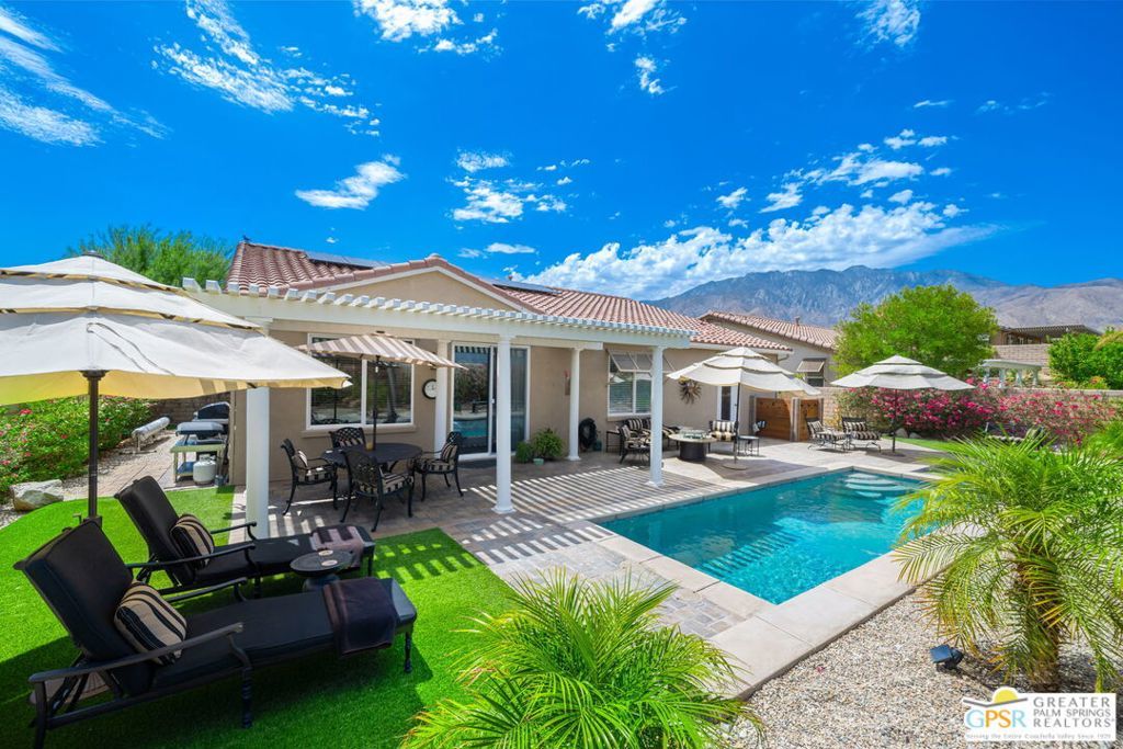 Accepting Back-up Offers. Pride Of Ownership and Elevated to The Next Level with over $161,000 in exceptional upgrades and tasteful remodeling. This beautiful Canyon I residence showcases an open, great room floor plan with 2,288 sq ft of living space, 2 bedrooms plus a den/office or 3rd bedroom and 2 remodeled and updated baths. The private rear yard with marvelous mountain views, complemented by your own private PebbleTec pool and spa, built in 2022, is ideal for entertaining friends and family. The 30-panel solar system provides ample electricity for the house, pool and electric car charging. A new energy-efficient Lennox HVAC system and all new ducting have been installed along with a whole-house Culligan water softener system. The custom glass entry door & windows greet you as you enter the house with attractive ceramic tile floors and upgraded energy efficient lighting throughout. The spacious chef's kitchen is comprised of an abundance of cabinetry, generous center-island, slab-granite counter-tops and stainless Kitchen Aid appliances - inclusive of a 5-burner cook top. The spacious Primary suite offers optimal privacy, and has a large walk-in closet, a luxurious bath, complete with dual vanities, new glass shower and an exterior door leading to the pool & spa. The guest bedroom has a sliding glass door, providing a separate exterior access along with a tastefully designed guest bath - customized with clear glass panel for tub/shower. The den/office can be easily converted into a 3rd bedroom with the installation of a closet. A separate laundry room consists of side-by-side washer & dryer, ample cabinetry and a deep basin sink. Four Seasons is a 55+ community and offers a fully staffed lodge 7 days a week, 3 pools, spas, outdoor BBQ area, tennis, pickle ball, bocce ball, hand ball, paddle ball & basketball courts, horseshoe pits & walking trails. Scores of resort-style amenities include; fitness center & aerobics, computer lab, ballroom, game rm & library. Always a calendar full of social events to enhance everyday living. And minutes away is the very heart of Palm Springs packed with energy, excitement, restaurants, shopping, social establishments, the Agua Caliente Casino and so much more. HOA dues include Frontier high-speed fiber-optic internet. Click on 'DOCS' for FLOORPLAN & UPGRADES.