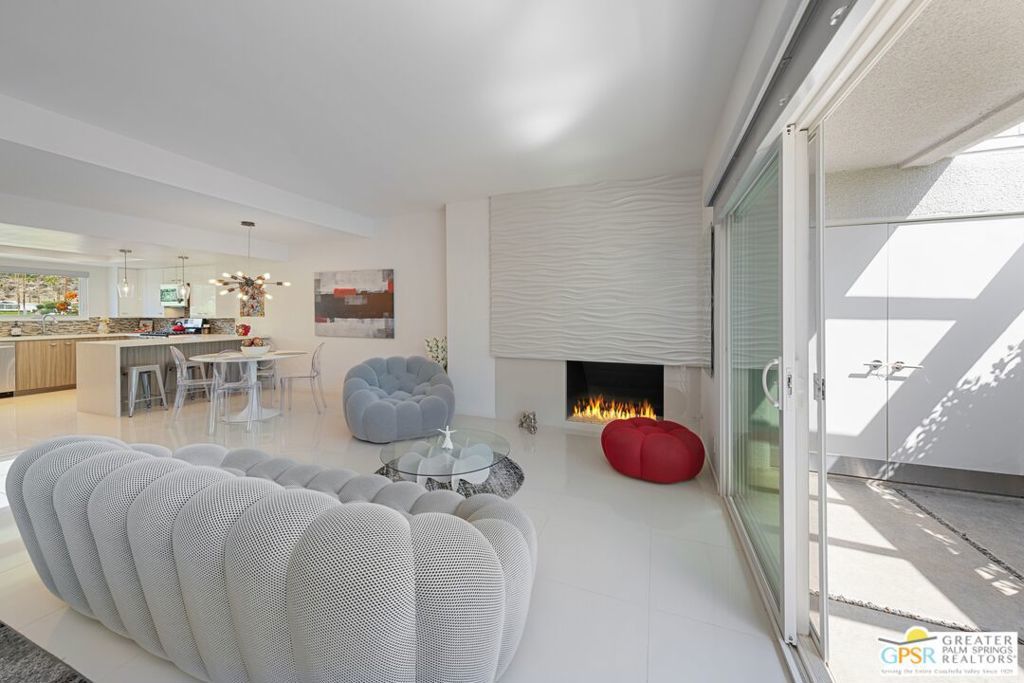 This stunning home was featured on the 2025 Modernism Week home tour - Welcome to this historic midcentury Villa Roma condominium in South Palm Springs! This completely renovated home has stunning direct mountain and courtyard views in the rarely available "Cleopatra" floor plan, featuring two bedrooms, two bathrooms, plus den. Stroll through a beautifully landscaped garden to your double-door entry foyer into your spacious great room, light and bright with gorgeous gas fireplace and private back patios. VILLA ROMA with its mid-century architecture was approved spring 2023 for historic district (Mills Act) status. Villa Roma's Roman revival details and grounds have been professionally maintained. Located on Fee Simple land (you own the land, not lease land) in the heart of the Indian Canyons neighborhood, features a clubhouse with iconic folded plate roofline. Stunning mountain vistas, substantial heated saltwater pool and spa are central hubs of this community. HOA dues include professional management, water, sewer, trash, common area and exterior maintenance including roof and exterior pest control. Spectrum Silver cable and basic internet included. Assigned carport space included. Additional covered parking available to rent from HOA. Guest Parking onsite. Enjoy everything South Palm Springs has to offer: surrounding mountain views amongst iconic homes. Smoketree Shopping Center, golf courses, hiking trails and downtown Palm Springs are minutes away. TV and furnishings available outside of escrow. Make your move to Historic Villa Roma today!