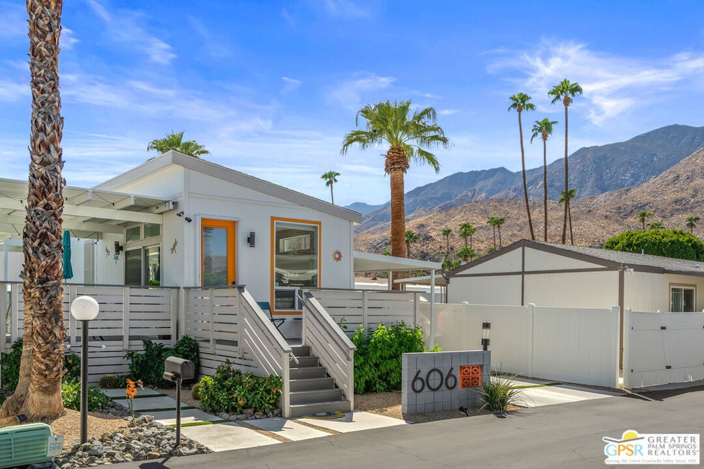 Discover the perfect desert getaway at the Palm Canyon Mobile Club, Palm Springs' premier mobile home community. This charming north-facing 1-bedroom, 1-bath home features a bright living room, a galley kitchen equipped with stainless steel appliances and quartz countertops, plus a sliding door leading to an expansive deck perfect for entertaining on warm desert nights. Just outside the primary bedroom, you'll find a sunny yard, ideal for relaxing with a good book or spending time with your furry friend. Enjoy the large community pool to cool off or unwind in the spa while taking in stunning mountain views. Conveniently situated near the renovated clubhouse, you'll have access to two dog parks, a fitness center, billiards, a lounge, a community kitchen, and a party room complete with a dance floor. Park approval is required for new homeowners in this highly desirable gated community. Monthly space rent is $1,250.