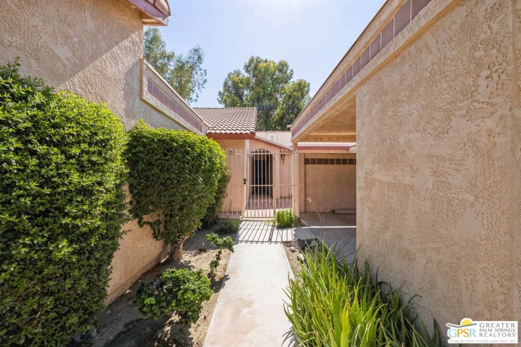 Seller Motivated ! ...Introducing a lovely condo now available in Indio, featuring 2 bedrooms and 2 bathrooms across a generous 1,218 sq. ft. of beautifully designed space, complete with picturesque views of the golf course. Indian Palms is eligible for Short Term Rentals, and is in close proximity to Empire Polo Fields, home to Coachella and Stagecoach festivals. The charming front yard is a paved area ideal for relaxing or entertaining. Into the house, the family room offers a spacious and inviting atmosphere, highlighted by a custom wet bar and stylish sloped ceiling that enhances the openness of the area. This bright space flows seamlessly into the kitchen, which boasts elegant quartz countertops, modern appliances, and plenty of cabinet space for all your culinary needs. Each bedroom is well-proportioned, providing comfortable access to the hallway and direct access to patios, making it perfect for both residents and guests. As an owner you will have access to the Clubhouse, Sports Bar, pickleball, tennis and golf. This condo combines comfort and elegance in a serene setting, making it the perfect place to call home. Don't miss out on this exceptional opportunity!