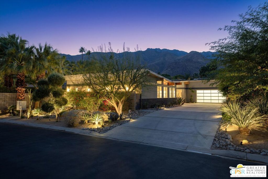 Escape to resort-style luxury living in this stunning mid-century-inspired home, featuring a classic butterfly roofline, located in the exclusive Little Tuscany neighborhood and just down the street from the famed Kaufmann house. With only six homes on this serene street, this property offers unparalleled privacy and style. Step inside to be greeted by breathtaking, dream-like views through expansive walls of glass that fill the living and dining areas with natural light. The open-plan design boasts exposed wood beams, ceilings, and pocket sliding glass doors, seamlessly blending indoor and outdoor spaces. An indoor water fountain adds to the tranquil ambiance, perfect for a relaxed desert lifestyle. The gourmet kitchen is a chef's delight, featuring high-end stainless steel appliances, sleek quartz countertops, and a spacious island with barstool seating. Adjacent to the kitchen, find a cozy dining nook and a TV den for casual relaxation. Each of the three ensuite bedrooms have beautiful wood floors, ensuring both comfort and style. The luxurious primary suite offers direct access to the pool and spa through sliding glass doors, while the primary bathroom features dual sinks, an oversized walk-in shower, a soaking tub, built-in dressers, and access to a private outdoor shower. Entertain in style in the lushly landscaped, corner-lot backyard oasis. The south and west-facing saltwater pool and spa are framed by mountain views, a cozy fireplace, built-in BBQ, citrus trees, and mature greenery for added privacy. Energy-efficient amenities include a pre-paid 44-panel solar system lease, dual HVAC systems, and dual tankless water heaters. The 2-car garage is equipped with an electric car charging outlet, an evaporative cooler, and extra storage space. Furnishings are negotiable as per an inventory list, making it easy to move in and start enjoying the Palm Springs lifestyle immediately.
