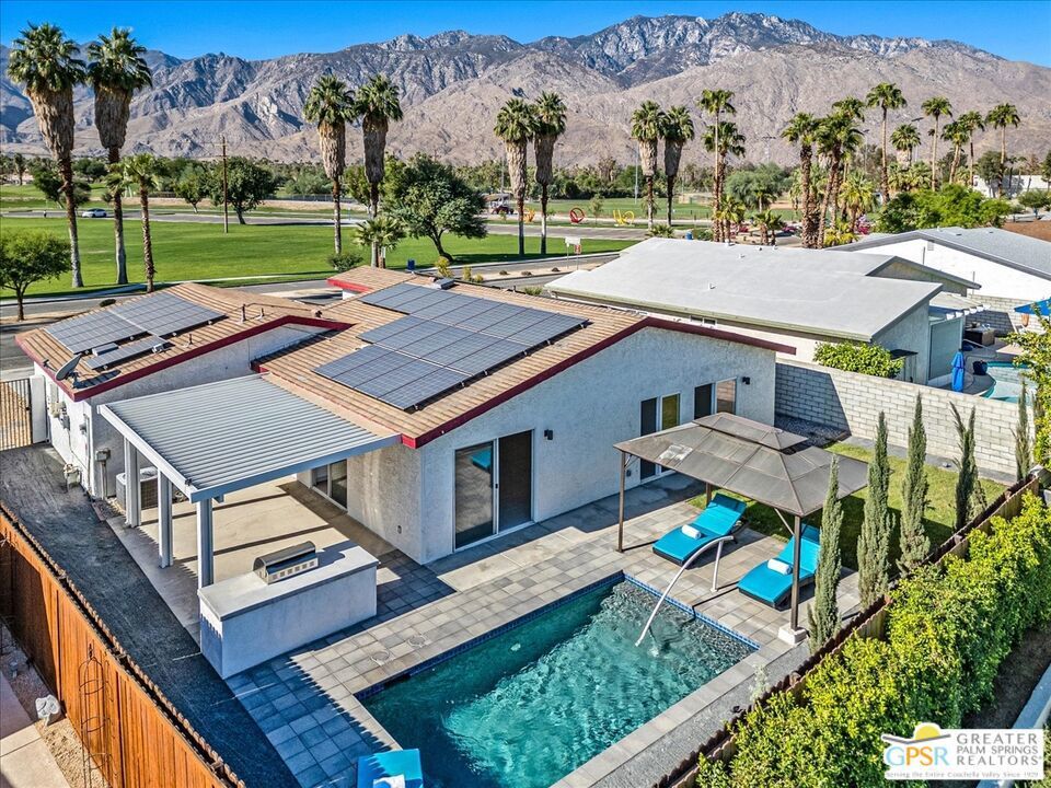 Nestled in the charming Demuth Park neighborhood, this stunning three-bedroom, two-bathroom home is your gateway to the ultimate Palm Springs lifestyle. Located just minutes from the vibrant heart of the city, you'll find yourself directly across from the expansive 61-acre Demuth Park, the largest park in Palm Springs. Enjoy panoramic mountain views and easy access to a hub of recreation, including soccer fields, baseball diamonds, pickleball courts, a community center, playgrounds, dog parks, and scenic walking and biking paths. Plus, the picturesque Prescott Preserve is just down the street! This home is brimming with value and features an array of impressive upgrades. Dive into your PebbleTec saltwater pool, entertain with ease in your outdoor kitchen, and enjoy the peace of mind that comes with a new water heater and updated plumbing. The landscaped yard is equipped with a sprinkler system to keep your outdoor space lush and inviting. And with a leased 40 panel solar system, you'll benefit from increased efficiency and savings during those warm summer months. Step inside to an open-concept living area bathed in natural light, featuring vaulted ceilings, modern ceramic tile, and seamless access to your outdoor oasis. The spacious two-car garage and large driveway provide ample parking for guests, ensuring everyone feels welcome. Short-term vacation rental permits are still available in Demuth Park adding extra opportunity for an income producing property. This home truly must be seen to be fully appreciated! Don't miss out on this incredible opportunity at such a compelling price. Call today for your private showing and start living the Palm Springs dream!