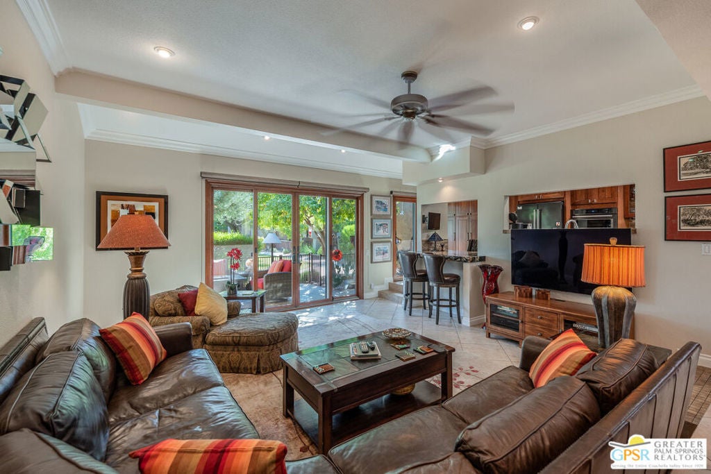 This turnkey furnished, refreshed, and extensively remodeled condo is a great find near Downtown Palm Springs! Located in a small, amenity inclusive HOA on fee simple land (you own), it makes for a perfect year-round residence or desert retreat in Central Palm Springs. This end unit has features seen in no other condo in the community including wood framed Anderson triple paned windows and sliders and raised cathedral ceilings in the formal dining room that features beautiful mountain views. Freshly painted, this home is light and bright with a stunning slab granite kitchen with beautiful wood cabinetry, black stainless appliances and a 5 burner stovetop with built-in oven, microwave, and wine fridge. Custom black out shades and pass through from kitchen to both sunken living room and dining room make entertaining simple and elegant year round. The primary ensuite bedroom offers built-ins with two nicely finished closets, walk-in shower with bench seating and dual shower head controls and dual sinks. The guest bedroom, currently used as a den, has access to rear patio and custom closet built-ins as well. This single level corner unit only shares one common wall and is located on the NW corner of the community away from street noise. Front and back patios, in-unit laundry, community pool/spa, tennis/pickleball courts, and clubhouse room round out this sophisticated offering that affords the indoor/outdoor lifestyle for which the desert is known.