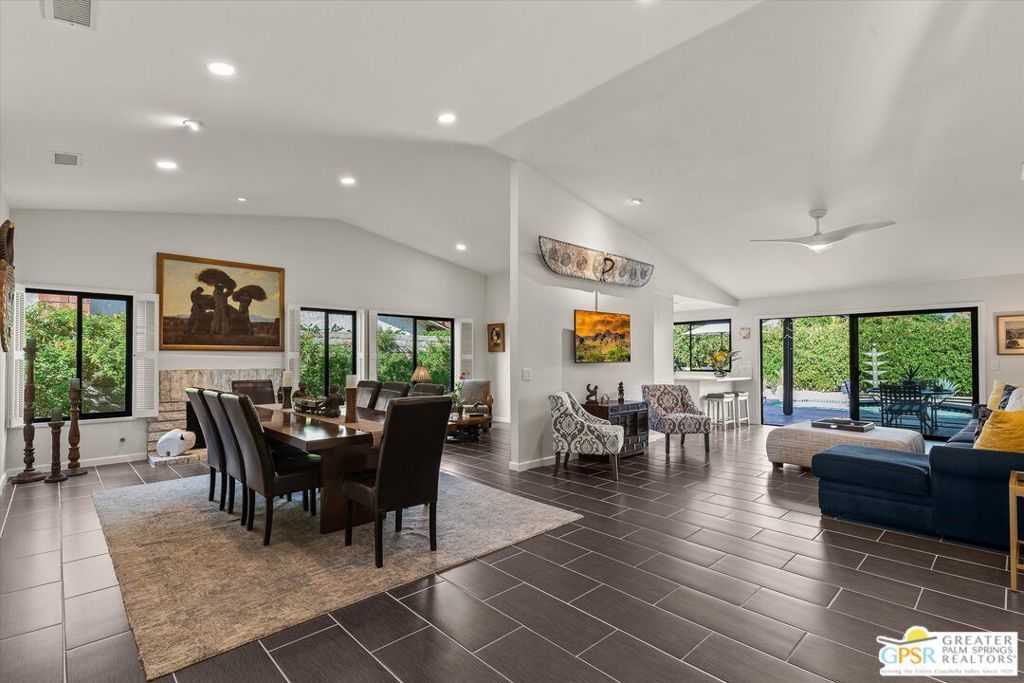 SELLER INVITES ALL OFFERS. Nestled in the serene enclave of Date Palm Estates is this immaculately maintained residence offering a harmonious blend of sophisticated design and comfort. No HOA and you own the land. The home's inviting curb appeal sets the stage for what lies beyond. From the private courtyard, step inside to discover an expansive living room, dining room with gas fireplace and an additional living space/TV area. The heart of the home is the tastefully remodeled kitchen featuring quartz countertops and backsplash, custom cabinetry, under counter lighting, induction stovetop, stainless steel appliances and a convenient kitchen counter/bar. Retreat to the primary suite which offers a sumptuous new spa-like bathroom complete with a floating vanity and a large picture window overlooking the private pool and spa. Two additional bedrooms and a second bathroom offer ample space for family or guests. The generously sized backyard is a totally private oasis that offers a sparkling pool and spa, low-maintenance landscaping and grapefruit, mandarin & lemon trees. Numerous upgrades include newer roof underlay, luxury vinyl flooring in the bedrooms and guest bath, upgraded electrics & plumbing, new art lighting, smart ceiling fans, Nest thermostat and much, much more. Move-in ready, this home is located along the desirable Gerald Ford corridor and a short drive to Palm Springs and El Paseo. Most furniture included in the sale.