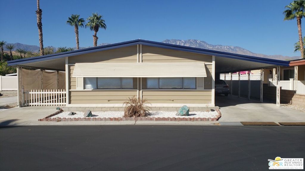 Welcome to El Dorado Palms Estates, a wonderfully located 55+ manuf home gated community....in south Palm Springs, away from all the wind north Palm Springs has to offer....minutes from the airport, shopping (the Trader Joe's/Target Center is right next door), restaurants, the arts (CV Rep), cinema (Mary Pickford Theater), entertainment (Agua Caliente Casino in Cathedral City), etc. The best about this gated community...unlike most 55+ manuf home parks in the valley which are rent space from $600s to $1200s per month, this one you OWN THE LAND, with a low HOA of $310/mo!! Two 18 hole Arnold Palm designed golf courses are nearby as well. This 2bed/2bath 1300+ sq ft home with large LR/DR and a Family Room off the Kitchen is ready for your personal touches/ugrades beyond the upgrades done by present owner and price reflects. What is noteworthy is each bedroom has walk in closet, NEW AC condensor this past summer, laminate flooring throughout, new fans & light fixtures installed (even recessed lighting in certain areas of the home), plus roof resealed, main electrical panel upgraded to 200V & plumbing from galvanized to flex in last 3 years. Come make this desert home, YOUR HOME. Offered aggressively at $225,000 with average upgraded sales in this park at $270,000 to $350,000. Community amenities include large clubhouse with banquet/meeting hall, full kitchen for private parties, billiards, card & reading rooms, exercise/fitness room, sauna ....multiple pools and one community size spa, also Tennis/Pickleball Courts in back end of park, RV parking (nominal monthly cost) mid park. This home will not last long, Come See/Make Offer.