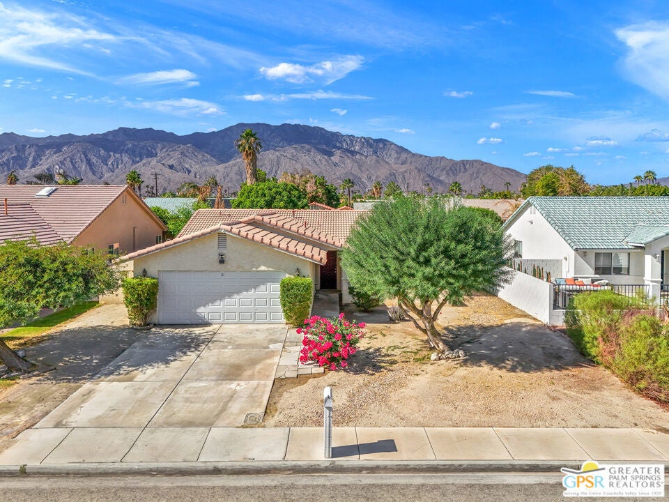 INVESTOR ALERT! Check out this 3-bedroom, 2-bath contemporary in Cathedral City's Upper Outpost neighborhood. Beamed and vaulted ceilings, open-concept living, and fantastic mountain VIEWS to the West begin to tell the story! The living room fireplace plays beautifully for the space and the adjacent oversized kitchen is a destination with room for a breakfast table or island. The nearby dining area opens to the private back yard. This would make a fine setting for a pool or possible guest house. You'll find no immediate power lines overhead which is another plus because these VIEWS are sensational. The Primary Ensuite features direct patio access, private bath, and walk-in closet. Guest Bedrooms #2 and #3 share a full bath. The utility room with laundry hookups and built-in cabinets connect to a 2-car garage. Home needs some TLC but upside is obvious! The best of Greater Palm Springs is all within reach from the central location near Date Palm Drive.