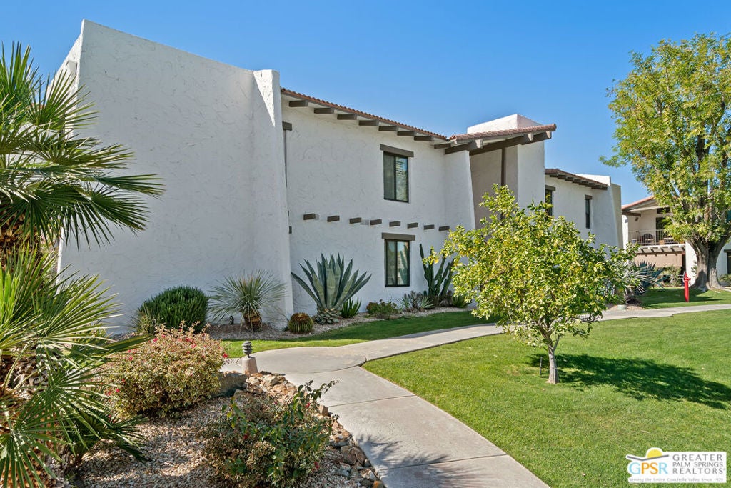 Wonderful 2 bed 2 bath home with updated New York style kitchen. This end unit offers natural light from windows on 3 sides and overlooks meticulously manicured grounds. Fresh paint, new HVAC, updated floorings and baths. Enjoy your private patio and dedicated private parking. Ramon Estados offers 2 pools and spas, tennis courts, pickleball and a community clubhouse. Located within walking distance to downtown Palm Springs where you will enjoy eateries, coffee houses and a host of retail shops. Minutes to Palm Springs International and walkable to grocery store and pharmacy. HOA dues include water, sewer, trash and gas. A great unit at a great price. Move in, unpack and enjoy!