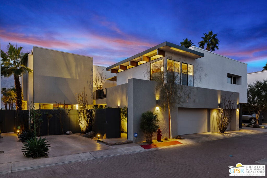 Experience luxury living in this sophisticated 2-bedroom, 3-bathroom townhome, boasting 1,766 square feet of meticulously designed space. Nestled in the hip and stylish sought-after 48@Baristo community, this architectural masterpiece designed by PS Modern offers west-facing views of the majestic San Jacinto Mountains, creating a breathtaking backdrop for your desert lifestyle (On Fee land/ You own). The home features soaring ceilings, skylights, clerestory windows, and walls of glass, flooding the space with natural light and seamlessly blending indoor and outdoor living. Beautiful gray ceramic tile flooring flows throughout, adding a contemporary and cohesive continuity with new white and gray color scheme exterior paint. Two updated, remodeled bathrooms and a sleek custom designed steel fireplace elevate the modern aesthetic, while 3 private outdoor patios provide tranquil spaces to relax or entertain. Your very own private pool and spa create a personal oasis, perfect for unwinding or hosting guests in style. The salt water pool features a new pool filter and updated automation controlled easily from your phone. The separate casita, complete with its own entrance, offers versatility as a guest suite, home office, or studio. Pride of ownership is evident throughout, with thoughtful upgrades including owned 26 Panel Solar System (HPE) with a battery back-up, a newer HVAC system + mini split, and a brand-new tankless water heater, and automated roller shades with added black out. Many more improvements, check out our improvements list sheet. Enjoy the convenience of an epoxy coated two-car garage and the security of this gated enclave, just moments from downtown Palm Springs. Take a short stroll to Spa Casino, movie theaters, farmers market, PS Swim center, library, shopping, museum, and vibrant dining.Clean, well-maintained, and truly sophisticated, this townhome is a rare gem that combines modern design with private luxury. Welcome to your desert dream home! HOA dues INCLUDE: water, roof, earthquake insurance, cable and internet. The HOA is well managed and in great financial shape with no assessments. HOA recently painted exterior in 2023. Plus YOU own the Land/ No lease!