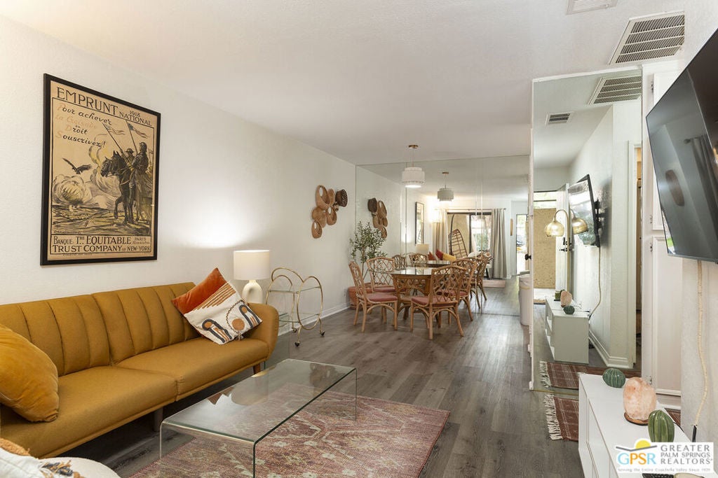 This could be your ticket to enjoy the Desert Lifestyle! This nicely appointed ground floor condo has an open floorplan which includes living and dining areas with a galley style kitchen. Offered turnkey furnished, it has been well-maintained with new HVAC and appliances in 2021 and easy care laminate flooring throughout. The ground floor unit is steps from the closest pool and spa - and close to parking for ease of in and out trips and near laundry. The view from the patio includes a greenbelt, as-well-as, the inviting pool area. The complex is gated with amenities that include pools and spas, tennis courts, dog park, picnic areas with BBQ and well-maintained lush landscaping. Located across from the Palm Springs Tram and Tourist Information Center, it is convenient to hiking trails, minutes from the downtown village and has easy access to the freeway. This condo is ideal for an easy weekend getaway, care-free primary residence or investment property. Come check it out!