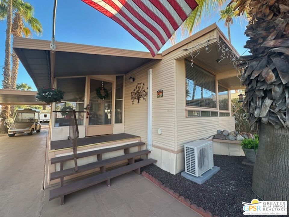 720 sq ft, 1 bedroom and 1 bathroom. An enclosed California Sun room. Dining room, open U-shape kitchen and the living room with large open windows. Oversized Bedroom to accommodate a California King. Laundry room in the closet with washer and dryer. The community is centrally located and nestled in between Palm Springs, Rancho Mirage, and other cities. The airport is 15 minutes and 20 minutes from the Amtrak train station and has overnight parking. Park fees are estimated.