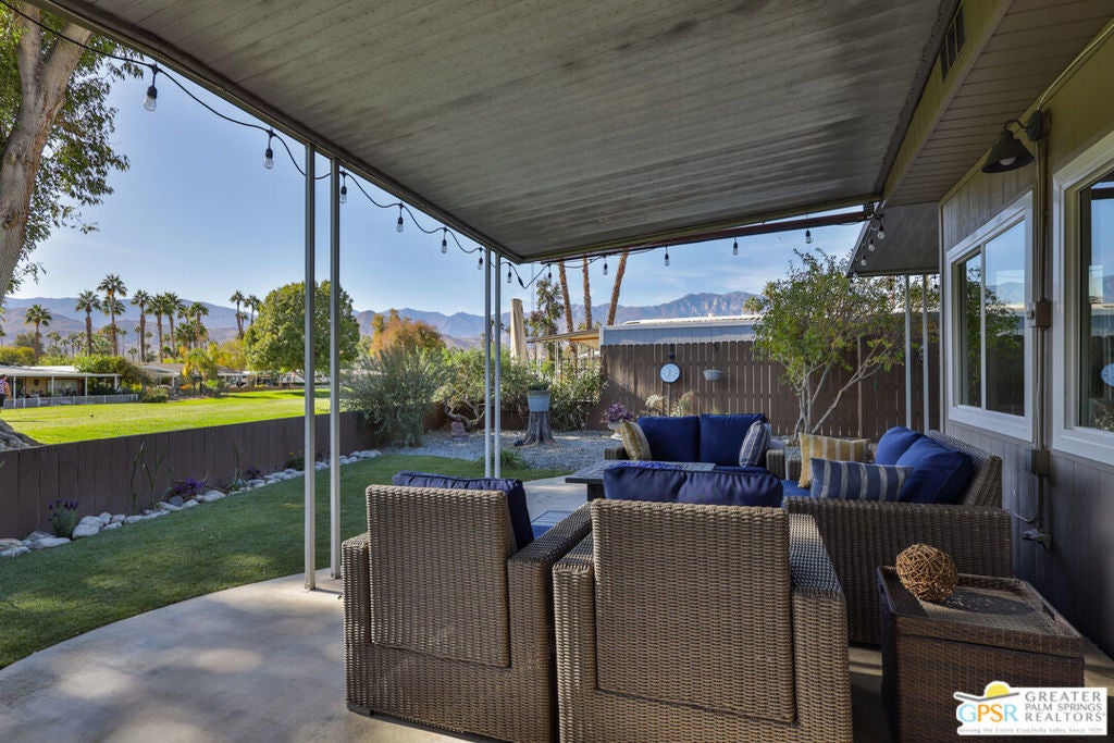 Come see this updated 1972 1440 sq ft, 2bed , 2bath with polished concrete floor bonus and storage rooms. This home is a must have golf course property located at the 6th tee with spectacular mountain views. Property is located in one of the premier 55+ guard gated golf course communities in the valley. So many improvements which includes: 33 solar panels with a 25 yr assumable lease ($210.90/mo) installed in 2021, Lenox 4-ton HVAC system and new water heater both installed in 2022. Current owners since 2022 have updated: custom tile master bath shower, new exterior doors, upgraded lighting throughout, designer window blinds plus improved hardware fixtures throughout the home and repainted interior. Home has central air/heat but also comes with energy savings thru use of Slim Line Master Cool Swamp Cooler. There have also been improvements to the undercarriage with tightened pier jacks and installation of a new rodent barrier. Exterior updates to landscaping, hot tub, natural gas BBQ, natural gas fire pit, and outdoor furnishings which are included, make the use of the outdoors as enjoyable as indoors. The home inside is being sold mostly furnished, there are tagged exceptions. Date Palm CC has many amenities, including golf, pickle ball, tennis, pools and spas, gym, on-site and golf pro shop plus many social clubs and activities. Don't let the space rent rate deter you. It is commensurate with what this park has to offer! over any like it in the valley. All this home really needs is... YOU!!