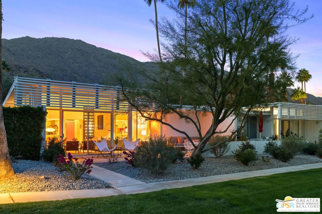 Tucked within the iconic Canyon View Estates neighborhood, this rare midcentury modern home represents a remarkable opportunity to live in one of Palm Springs' most sought-after communities. Situated in a prime location, this condominium is one of only eight end units with a level roof, providing a distinct architectural profile and enhanced privacy. The interiors are bathed in natural light thanks to a series of clerestory windows, a signature feature of mid-century design, that stretches across the entire southern side and uniquely crowns the kitchen space. The sliding glass doors off the back invite the outdoors in, offering breathtaking, panoramic views of the Andreas Hills. Canyon View Estates, a celebrated example of midcentury modern architecture, was designed by the esteemed architect William Krisel and is coveted for its clean lines, open spaces, and seamless integration with the desert landscape. This community reflects the best of the era, with an emphasis on both style and functionality. Inside, the property retains much of its original charm, including unique tile designs in both bathrooms that evoke the timeless aesthetic of Palm Springs' midcentury style. Storage is abundant throughout the unit, with cleverly designed cabinetry and spacious closets ensuring that every inch of space is both beautiful and practical. Whether you're looking to unwind on the private patio while enjoying views of the desert mountains or embrace the architectural richness of the space, this condo offers a rare opportunity to own a piece of Palm Springs history in one of its most iconic neighborhoods.