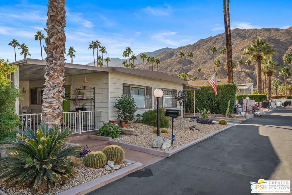 Welcome to Your Legacy Home in South Palm SpringsThis charming and well-loved home sits on one of the larger lots in the community, offering space, warmth, and breathtaking views. With two bedrooms, two bathrooms, and two bonus extension rooms not included in the square footage, this 1,440 sq. ft. home is a true gem, blending comfort with timeless charm.Inside, the home feels fresh and inviting, thanks to new paint, plush carpeting, and thoughtful upgrades. Custom ceiling treatments and newly installed ceiling fans add both style and functionality, while the top-down, bottom-up custom shades let in just the right amount of light. The bathroom has been beautifully updated with new flooring, and Phantom screen doors have been installed to enhance the indoor-outdoor living experience.Step outside into the expansive backyard, where artificial turf creates a low-maintenance oasis, perfect for relaxing or entertaining. A private spa off the back patio provides the ultimate retreat, allowing you to unwind while soaking under the stars and taking in the stunning views of the San Jacinto Mountains. Additional features include two large storage sheds and three tandem covered parking spaces, complete with an EV charger to meet modern needs.This home is part of the fully gated Palm Canyon Mobile Club, a vibrant community offering an array of amenities, including a large heated pool, spa, clubhouse, shuffleboard, billiards room, state of the art gym, Fire Pit and 2 dog parks.This home has been meticulously maintained, the owners have reinforced and leveled the foundation ensuring lasting stability. Situated in the desirable south end of Palm Springs, you'll enjoy living outside the windy zone while remaining close to downtown's vibrant shops, restaurants, and entertainment.This property is perfect for those seeking comfort, functionality, and breathtaking mountain views in the heart of South Palm Springs. Don't miss this incredible opportunity!