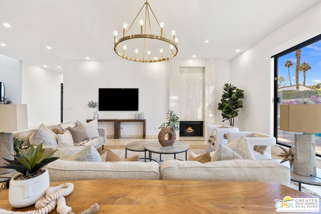WOW! If you are looking for CONTEMPORARY flair with RESORT-STYLE living, check out this FRESHLY improved 3 bed + den, 3 bath detached home behind the gates of Country Club Estates! Key highlights include tall ceilings, designer finishes, floor to ceiling windows and sliders, private pool and yard with low maintenance landscaping, and paid for solar panels! Three car garage, too! Living in Country Club Estates also includes enjoyment of resort-style amenities including a community pool, spa, pickleball and tennis courts as well as a location that is across from Eisenhower Health and only minutes to shopping, dining and multiple entertainment venues. Truly a WINNER! Formal entry leads to the light and bright west-facing living room that has tall ceilings, gas fireplace, stone flooring, wet bar, mountain views, and a sliding glass door that opens to the private pool. Adjacent dining area also offers views and two sliding glass doors that open to the outside. Separate kitchen with stone counters, stainless appliance suite, detached island, and casual dining area also offers views as well as access to the outside. The reimagined Primary Ensuite feels like a RH showroom with a grand entry that includes a newly built wet bar. You will love the pool and mountain views as well as the two sliding glass doors that open to the outside as well as the spa-like bath that features a custom designed closet and wardrobe area, dual sinks with designer lighting, large walk-in shower, and separate soaking tub. Talk about a retreat! Bedrooms Two and Three have each access to a hallway bath with shower/tub. Den (or optional Bedroom Four) is near an additional bathroom with walk-in shower. Private laundry with sink plus direct access to the attached three car garage.
