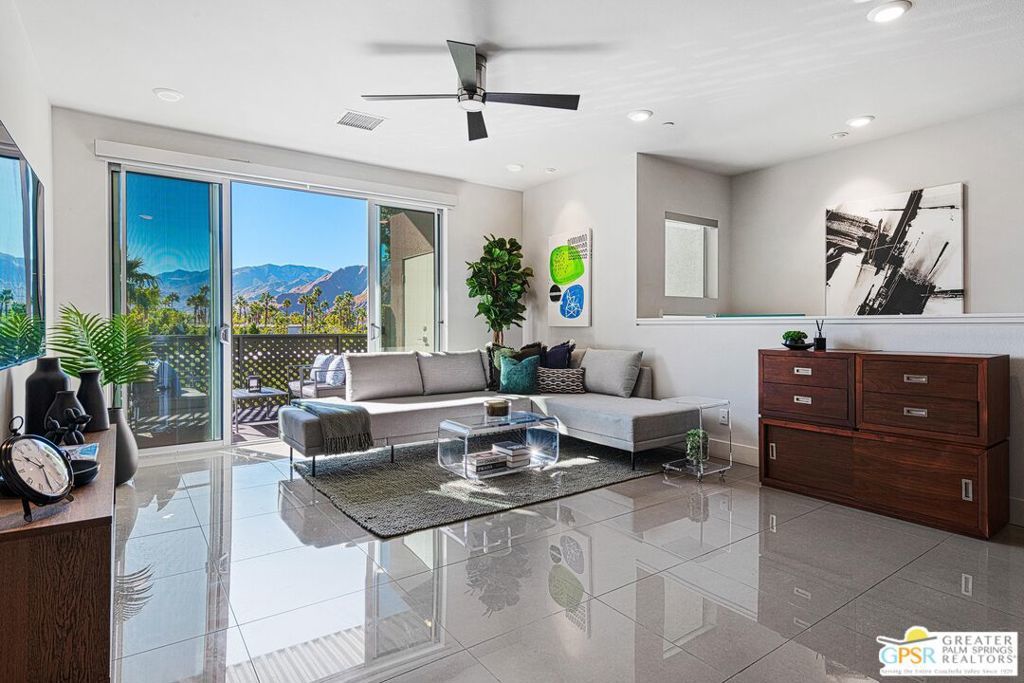 Discover modern luxury and incredible views at 140 The Riv! This 2-bedroom, 2-bathroom condo spans 1,226 square feet and features sleek porcelain tile floors, a stylish kitchen with a spacious island, and owned solar with 10 panels for energy efficiency. Step onto your private balcony and take in the breathtaking South and West views of the San Jacinto Mountain range, or relax in the beautiful community pool and spa, which also offers stunning mountain views. This residence blends contemporary design with the serenity of nature, all within an exceptional community setting. Don't miss this opportunity to make this your desert paradise or turn-key investment property.