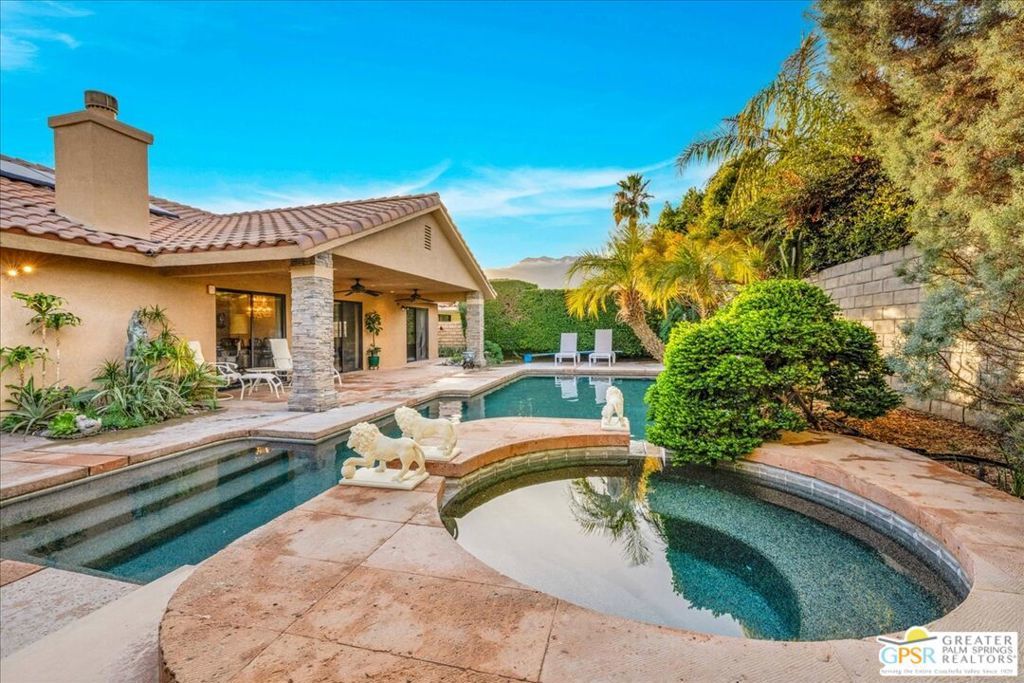 Imagine coming home to a residence that exceeds all expectations a place that warmly welcomes you each day. After parking in your spacious two-car plus golf cart garage, step inside to an open-plan great room, where a stunning wall of glass sliders seamlessly connects the indoors to an inviting outdoor living space. Here, you'll find a relaxing pebbletec lap pool and bubbling spa, perfect for unwinding. The beautifully designed backyard also features a covered patio, an entertainment area with a built-in barbecue, and a tranquil Zen garden. Lush, professionally landscaped greenery and a high hedge provide both privacy and security.Adjacent to the dining area, the expansive kitchen is a chef's dream, complete with a central island, a charming breakfast nook with bay windows, and sleek stainless steel appliances that make cooking effortless.The luxurious primary suite is a private retreat, featuring a dressing area, an extra-large walk-in closet, and your choice of a spa-like soaking tub or a two-person shower. On the opposite side of the home, two well-appointed bedrooms share a full bathroom. An additional bedroom with its own private bath is currently used as a TV room and office. All three bedrooms have been newly carpeted for added comfort.For added convenience, the home includes a well-placed laundry area with a washer and dryer, providing easy access to the garage. If a Golf enthusiast. you are minutes away from Cimarron Golf Course, and Desert Princess Golf and Country Club. Doubletree Hotel and Resort is is a very short drive away as is Convent shopping center. This exceptional home is designed for both comfort and elegance; offering the perfect blend of relaxation, functionality, and style.