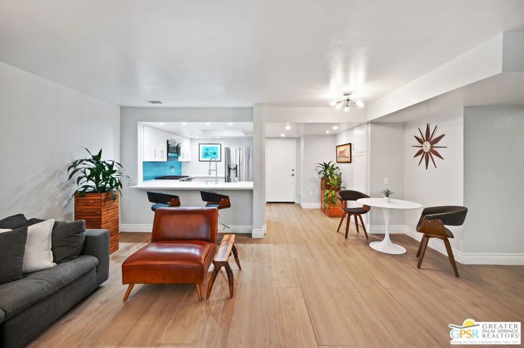 Priced to SELL! Discover Riviera Gardens, a serene retreat nestled in the vibrant heart of Palm Springs! This beautifully updated 2-bedroom, 2-bathroom ground-floor condo is situated on fee land (you own the land) and offers the perfect blend of style, comfort, and convenience. The open floor plan features woodgrain porcelain tile throughout and a wall of floor-to-ceiling sliding glass doors that invite the iconic indoor/outdoor lifestyle Palm Springs is known for. The modern kitchen boasts quartz countertops, soft-close cabinetry, and stainless-steel appliances, including a range with air fryer capability and a porcelain apron-front sink. The spacious primary suite offers dual closets and a tiled shower. The second bedroom, with its own sliding glass doors to the patio, is adjacent to a well-appointed guest bath with a tiled shower and vanity. Additional highlights include a spacious pantry, a stackable washer/dryer conveniently located near the primary suite, double-pane windows, Ecobee thermostat, and a newer HVAC system and water heater. Enjoy assigned covered carport parking with guest parking available. Set in a gated community with lush, manicured grounds, Riviera Gardens offers four sparkling pools and spas, making it a true desert retreat. Ideally located near the Uptown Design District and downtown Palm Springs, you'll have easy access to world-class dining, shopping, and entertainment. This move-in-ready condo is perfect as a full-time residence, vacation getaway, or investment property. Don't miss this opportunity to own your piece of paradise!