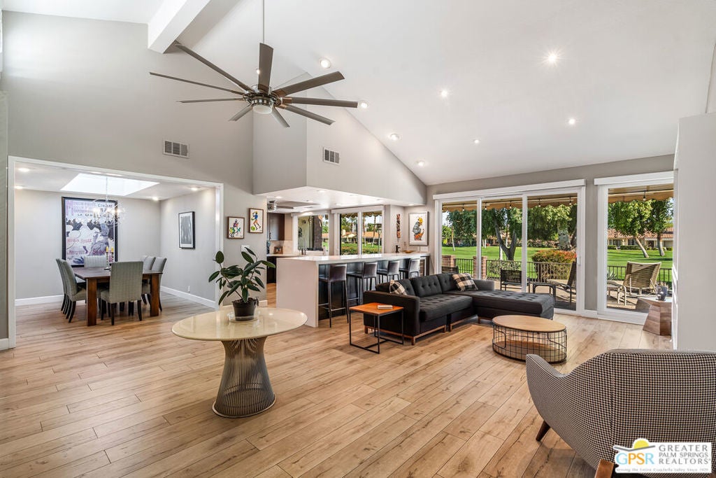 Welcome to your ultimate desert getaway in the highly desirable Monterey Country Club! This completely renovated 2 bedroom + Den, 2 bathroom condo combines modern luxury with serene living. Thoughtfully designed finishes throughout create a calming ambiance, making this home a true sanctuary. The main living space boasts soaring high ceilings, filling the home with an abundance of natural light and offering an airy, open feel. The beautifully updated kitchen features premium appliances, sleek cabinetry, and an elegant backsplash, perfect for cooking or entertaining. Both bathrooms have been upgraded with spa-like touches for ultimate comfort. Step outside to your private patio overlooking the golf course, where you'll enjoy breathtaking fairway views and peaceful desert sunsets. Whether sipping your morning coffee or hosting an al fresco dinner, this space is sure to become a favorite spot to relax and unwind. Situated in the heart of Palm Desert, Monterey Country Club offers resort-style living with 27 holes of golf, tennis, pickleball, fitness facilities, and multiple pools. Close to shopping, dining, and entertainment, this is the perfect place to embrace the desert lifestyle. Monterey CC allows Short Term Rentals which is a huge plus for owners looking to offset some of the ownership cost! Don't miss this opportunity to own a truly one-of-a-kind property in an unbeatable location. Includes all furnishings except for a few pieces of art! Golf cart is also available for purchase outside of escrow. Schedule your private tour today!