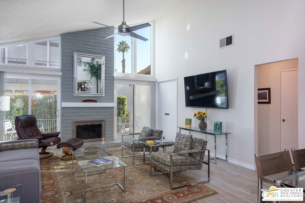 Rarely available single-level 2 bedroom, 2 bath condo in the Sunflower Complex. Beautifully maintained and nestled in the heart of Palm Springs, offering an ideal blend of comfort, location and lifestyle. Perfect for a vacation home or a primary residence. This condo has large dual pane windows and sliding doors allowing natural light into vaulted ceiling living areas. Kitchen has granite countertops and contemporary appliances; range, refrigerator, and dishwasher. 1,199 sq. ft. of living space with washer/dryer and two parking spaces, one car garage and carport. Main area features newer tile flooring with carpeted bedrooms. Offered furnished per inventory. The HOA includes water, sewer, trash, large community pool and spa, exterior maintenance, landscaping with 30 days minimum short-term rentals. Convenient location with grocery, cafes, library, Mizell senior center and Sunrise Park all just across the street. Downtown Palm Springs is just minutes away. Condo will be sold with furnishings.