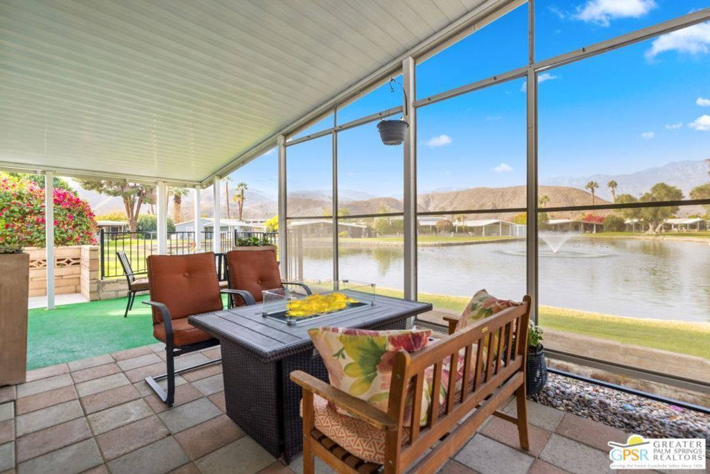 Fabulous TURNKEY FURNISHED updated home with magnificent golf, lake/pond and mountain views---best location by far in this highly sought after Active Adult (55+) guard gated community called Date Palm CC. 18 holes of golf, onsite restaurant, clubhouse with main pool/spa, sports pavilion, tennis/pickleball courts, satellite pools/spas,,even a dedicated doggie park complete this country club setting. Besides all this luxurious interior-designed home has to offer, enjoy the spectacular unobstructed west facing views of the mountains, community lake/pond and golf course from main area and covered patio. Home offers walnut wood plank flooring, built-ins, and easy flow from entry way (with a 1960s vibe floor that immediately catches your eye) to LR, Dining area plus kitchen. The kitchen and bathrooms were designed with a focus on senior occupants that includes lever style door handles, low step thresholds and wider doorways. Kitchen has quartz counters with under mount drawer glides and soft close drawers and cabinetry doors. The raised dishwasher is just another great feature for loading and unloading with minimal back straining. Stainless steel appliances feature wireless connectivity. Master bathroom features porcelain tiles on floor and shower walls. Floating counter has natural stone vessel sink and modular cabinets. Shower features no-step access entry with a tile mosaic floor for slip free traction . New electrical panel box installed in late 2017; HVAC in mid-2019 controlled by Nest thermostat, new Washer/Dryer units and new pet fencing installed recently too.. Window type AC unit installed to provide cooling in glass enclosed office space. Gardening area comes with drip irrigation that covers the bushes, shrubs and trees. There's a carport that handles 2 car tandem parking. Concrete pavers on covered patio overlooking those fabulous west views. Enjoy the desert nights warmed by the fire pit table. This is a one of a kind home where you can enjoy the desert lifestyle that this valley has to offer. Best yet, it's located near back end of park for easy in, easy out via security pass-enabled back gate. Come See, Make offer .... And did I forget to mention leased ($160/mo) solar panels for wonderful year round energy savings!! Don't let the space rent rate deter you. It is commensurate with what this park has to offer! over any like it in the valley.