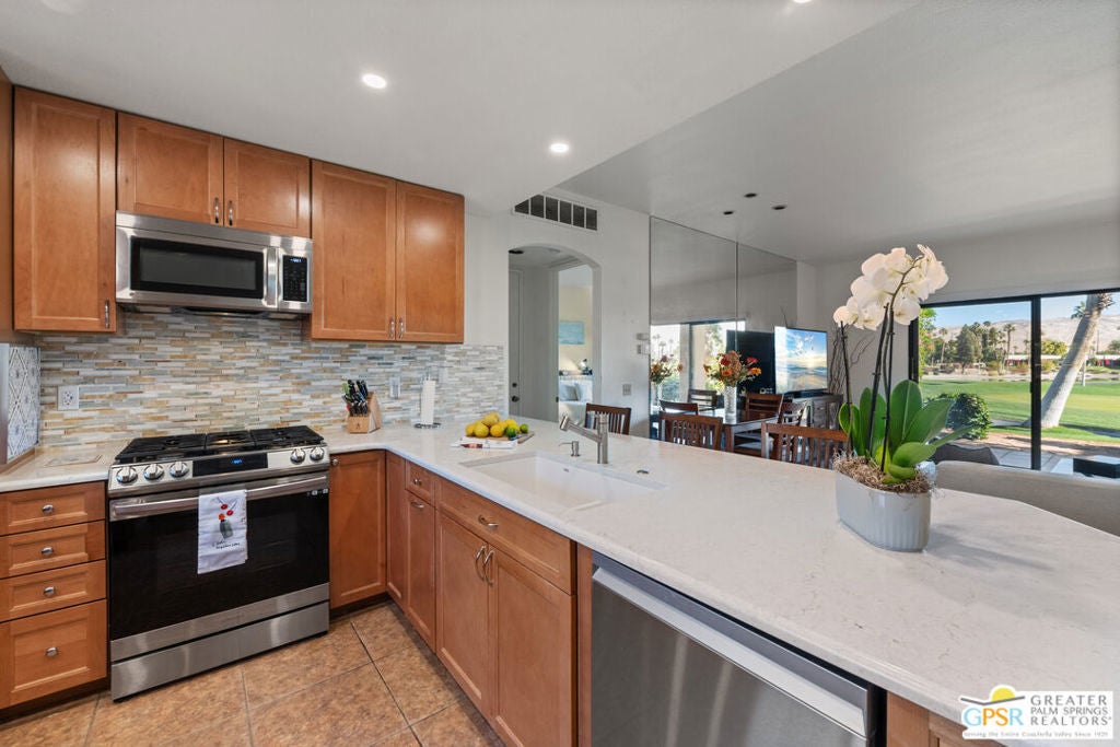 What is special about this home? Can you say interior panoramic views extending over the lush greens, then onto a serene lake and then up to the majestic mountains? Well you can with this home. Views galore! This cozy 2 BD 2 BA, 1,212 sq ft condo is situated on the highly sought out golf course at Desert Princess Country Club, an enchanting golf community that defines desert lifestyle, living and luxury! The thoughtful floor plan compliments the residence with two primary suites, each with double vanity en-suite bathrooms and spacious closets. The exquisitely remodeled kitchen features quartz countertops, onyx backsplashes, additional cabinetry, and smart appliances. The expansive great room will provide many nights of relaxed evenings. Enjoy capturing memories with family and friends on your back patio, which expands across the whole length of the unit. Access the outdoors via three separate sliding doors! In unit washer and dryer for convenience. Very close proximity to a community heated pool and jacuzzi. This home is updated with a new gate and electrical outlet for golf cart parking in the front patio, as well as a new door and opener for the detached garage which is perfect for parking your car or for ample storage! What is special about Desert Princess Country Club? Immerse yourself in the allure of a 27-hole golf course, free from tee-time lotteries and initiation fees. Acclaimed as one of the valley's finest! Guard gated community with a clubhouse and restaurant, lake, serenity views, 7 Plexipave US Open blue/green tennis courts, remodeled fitness center, bocceball courts, championship pickleball courts, climate controlled racquetball courts, squash, basketball and swimming, spa and more! This tranquil Desert Princess Country Club invites you to experience the unique blend of luxury, diverse community, and leisure all conveniently located minutes from upscale lodging, dining, shopping, casinos, the international airport, and more. Interested in a property investment? Desert Princess HOA permits seasonal, short-term, and long-term rentals and provides 24/7 entry and patrol services. Land Lease extended through 2069.