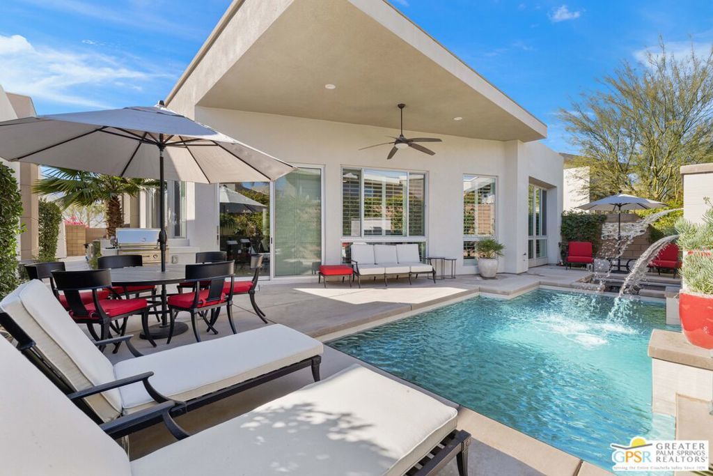 HIGHLY-UPGRADED and FURNISHED 3 bed + den/office, 3 bath "Avant" home located on a cul-de-sac home at Escena Golf Club! This IS the one to see if you are looking for EXCEPTIONAL upgrades AND a 3 bedroom home PLUS a separate den/office! Escena Golf Club is a gated Nicklaus designed championship golf course that features a mid-century modern inspired clubhouse which houses Escena Grill, the on-site restaurant. Friendly community great for walking and biking! Community dog parks, too! Formal entry sets a scene of magic that leads to a showcase kitchen that opens to the light and bright dining and living areas! You will especially love the tall ceilings, four clerestory windows, walls of glass and easy access to the backyard that is styled up with a private pool and spa as well as a built-in BBQ with casual dining area! Back inside, the large kitchen has an expansive detached island, quartz countertops and backsplash, contemporary cabinets, and stainless-steel appliance suite that will make entertaining easy! Built-in laundry and easy access to the attached two car garage. Primary Ensuite has custom built-in entertainment center, plantation shutters, window treatments, views of the pool and spa, and a private ensuite bath with dual sinks, walk-in shower, separate tub with above skylight and a walk-in closet with custom cabinets. On the other side of the house is Junior Ensuite Two with views of the front courtyard, plantation shutters, and a private ensuite bath with a large walk-in shower. Separate den/office with built-in desk and bookcases makes this one unique! Separate Guest House (Junior Ensuite Three) has mountain views, plantation shutters, and a private ensuite bath with walk-in shower. Owned solar panels and system, too!