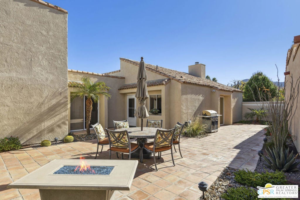 Experience tranquil living in this meticulously maintained Las Casitas home, perfectly positioned on a serene south-facing greenspace with pond and spectacular mountain views! This thoughtfully designed residence offers an ideal blend of indoor-outdoor desert living with an inviting front patio featuring custom tile work, desert landscaping, BBQ, and views - perfect for entertaining or peaceful relaxation. The interior welcomes you with vaulted ceiling and an open concept living area anchored by a cozy fireplace. The updated kitchen, equipped with new/newer appliances, opens onto the dining space. Two generously sized bedroom suites, positioned for optimal privacy, each feature renovated ensuite bathrooms. The primary retreat opens to the back patio greenspace and includes a walk-in closet, tiled walk-in shower, and dual vanities. The guest suite boasts a full tub and direct access to the private front patio via sliding doors. Additional features include an attached 2-car garage with ample storage. Being offered furnished for move-in ready convenience. Rio Del Sol amenities include community pool/spa, clubhouse, tennis courts, and dog park. Las Casitas residents enjoy exclusive access to 2 additional pools/spas and lake. Don't miss this rare opportunity to own a piece of paradise in this sought-after community! The HOA fees include: Spectrum cable, weekly trash pick-up and street cleaning, earthquake insurance, daytime guard gate, maintenance of all common grounds. 30 day rentals are allowed.