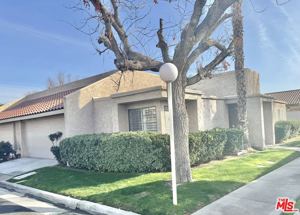 Valley Palms community in the middle of Palm Desert, this all age gated community offers a great location close to all shopping, Acrisure Arena, Indian Wells Tennis, freeway entrance. This unit, tucked nicely inside the complex, is 2/2 with a primary suite, special features include high vaulted ceililngs, attached private back patio, updated kitchen and baths, beautiful natural light w plantation shutters on all windows, oversized 2 car garage w large loft storage space. HOA maintains: building/roof maintenance, landscaping, trash, pest control, internet/cable. Amenities include 2 pools-hot tubs, pickleball and tennis courts, basket ball court, walking trails. Pool/jacquzzi is located across from the unit.
