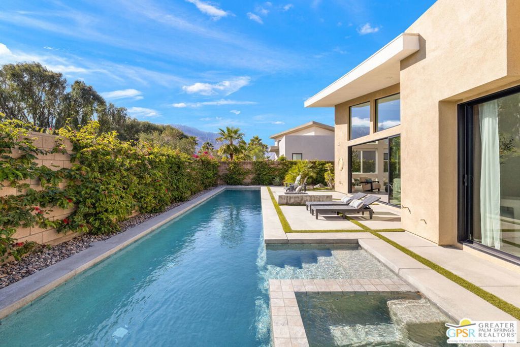 Are you looking for a STREAMLINED modern home where EVERYTHING is right? Where details matter and a passion for design is Dwell Magazine worthy? The approach to technology is just as exciting and includes OWNED SOLAR. Vaulted ceilings, amazing finishes, exceptional indoor-outdoor flow onto patios framing the home, and San Jacinto Mountain views! Clerestory windows work their magic overhead. Modern cabinets, professional grade appliances, and a STUNNING over-sized island are highlights in the spacious kitchen with walk-in pantry. There's a dedicated outdoor dining area with barbecue grill + bar, poolside firepit, and refreshing 55-foot saltwater lap pool + spa. The flow from one patio to the other works beautifully on the entertaining front. Back inside, bedrooms enjoy a nice separation with an Ensuite Primary enjoying easy access to the pool. The primary bath shines with separate vanities, separate tub + shower. The oversized walk-in closet is a delight and features direct access to the utility room. On the opposite end of the home, Guest Bedroom #2 and Guest Bedroom #3 share a full bath. Powder bath is located along the main hall as well. Take the Matterport VIRTUAL TOUR for a better sense of flow. Notable upgrades include designer curated outdoor lighting and desert-wise landscaping, water leak detection system (flume) for the home and dedicated leak detection in the laundry room (Notion), sensors on garage door & back door (Notion), Smart locks on outdoor gates and main door (Lockly) with camera, TV 5.1 Sound system (Denim), Kitchen sound system (Niim), security cameras with human detection (Onwote 4K poe system) and pool solar panels (SPH 600 sqft Swimjoy panels). Energy saving features include tankless water heater, artificial turf, low-E windows, and owned Solar. The best of Palm Springs is a short hop away and The Escena Golf Club + Grill are icing on the cake. Enjoy it all!