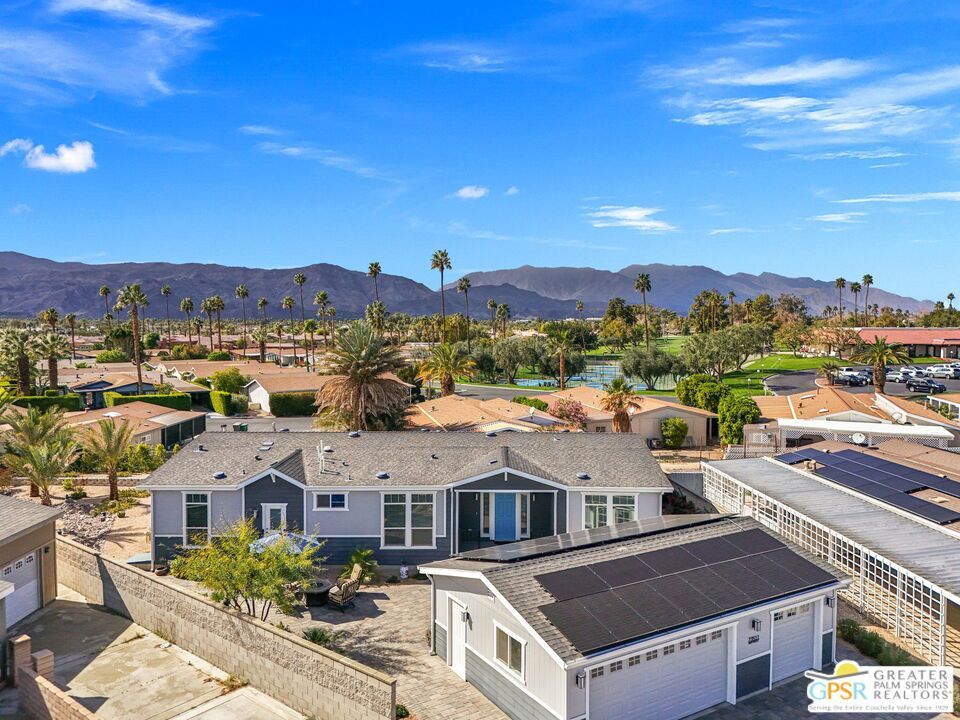 The ONE TO SEE! Built in 2022, you'll love the outstanding VIEWS, stylish finishes, and privacy. Palm Desert Greens Country Club is the backdrop with its active 55+ approach to desert living. Motor down Country Club Drive for a closer look at this lovely setting on Red Circle which delivers on all fronts including gorgeous landscape + hardscape design. At 2,589 square feet, this is one of the larger floor plans designed by Clayton Homes. 3-bedrooms (with possible 4th), plus den, and 2-bathrooms. Rooftop SOLAR plus 2-car detached garage with dedicated golf cart parking. The formal entry leads to living and dining areas framing an island centered kitchen where stylish finishes work their magic. VIEWS TO THE WEST and SOUTH cannot be overstated! French doors swing open from the den to the garden delivering easy indoor-outdoor flow. There's an East-facing patio too. Bedrooms enjoy a nice separation with the Primary Ensuite positioned along a dedicated wing and includes an oversized walk-in closet, handsome built-ins, and spa-inspired bath with dual vanities. Guest Bedroom #2 and Guest Bedroom #3 are located on the opposite end of the home and share a full bath. Nearby home office/study could easily work as Guest Bedroom #4. Utility room with laundry sink features direct access to the patio. Take the Matterport VIRTUAL TOUR for a better sense of flow. Palm Desert Greens Country Club is a private, guard-gated manufactured home community. The 18-hole executive golf course with no initiation fee takes center stage with. Low HOA fees and YOU OWN THE LAND. The clubhouse features a popular restaurant, lounge, and fitness center. There are 3 pools + spas, shuffleboard, tennis, bocci, and busy social calendar! The best of El Paseo and nearby Rancho Mirage are both short hops away. Enjoy it all.