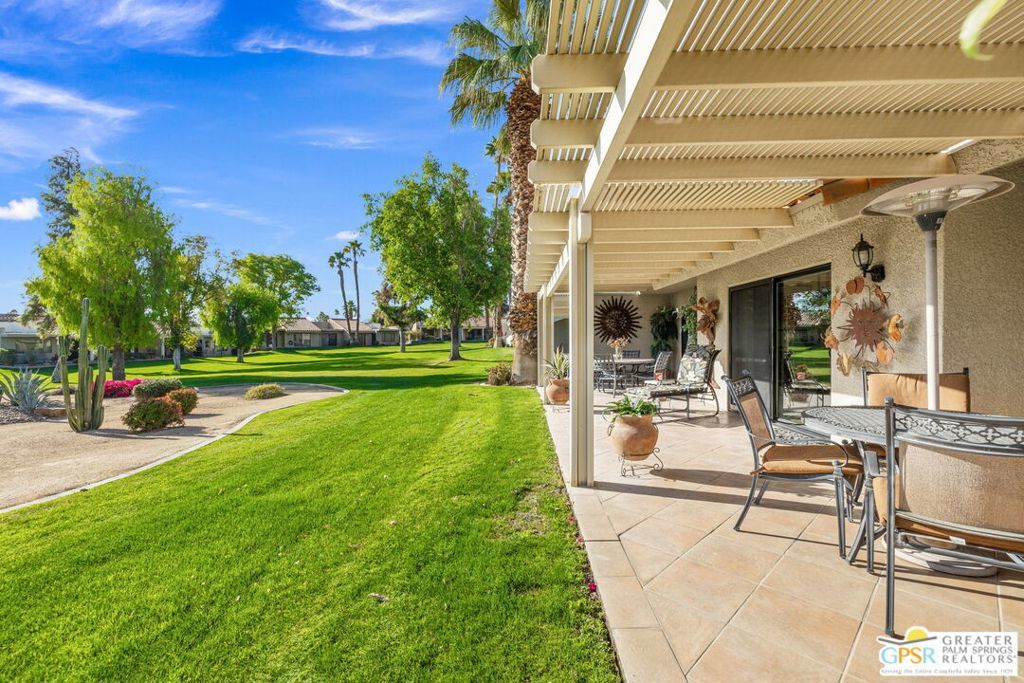 Introducing this spectacular Vintage model within the Palm Desert Resorter that soars above the rest in a prime greenbelt location. Numerous valuable upgrades including attached newly installed 2 car garage with EV charging outlet, extended patio with alumawood awning, newly installed tankless water heater, custom cabinets in both walk in closets and garage and ALL sliders & windows have recently been replaced. Upon entering, you'll be awed by the light and bright feel with open concept kitchen with long peninsula counter top with barstool seating with handmade cabinets. Intelligent floor plan with owner's suite and bath is on one side of the home and guest bedroom and bath on the opposite, which is perfect for privacy and separation and makes this the most popular model. Both bathrooms have quality finishes and there's tile throughout the home. Quality furnishing included! Relax in the back patio with gorgeous greenbelt view and just steps from the pool and a very short distance to the clubhouse(very convenient for dining and golfing). Palm Desert Resort CC features 18-hole championship golf course, newly renovated clubhouse, 20 pools and spas, and the Coachella Valley's premiere pickleball and tennis club. Triple threat home makes it a perfect for primary residence, vacation rental or second home.