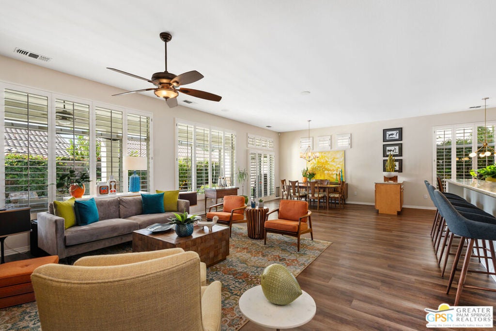 Desirable Victoria model with only 30 of these homes ever built in beautiful 55+ Sun City Palm Desert. This highly upgraded 2 bedrooms/2.5 baths home plus a large den (or potential 3rd bedroom/office). Incredible curb appeal with lush landscaped yard, new exterior paint and stone accents. Once inside, the formal entry hall opens up to a beautifully enhanced great room with fireplace, custom shelves and media center, with built-in surround sound. New luxury vinyl floors are throughout the majority of the home with new carpet in the guest bedroom and den. The showcase kitchen is stunning with both a central prep island and large elevated bar seating for 6+. Slab granite counters, updated s/s appliances, gas cooktop, double oven, recessed lighting and pull-out shelves make this a true chef kitchen. Primary bedroom suite has a bay window with a view of the yard, walk in closet, refreshed bath with dual vanity sinks, stall shower, large tub and private WC. Spacious guest suite has its own walk in closet and is tucked away creating ultimate privacy for all. Laundry room has added pantry storage, sink, washer/dryer included. Oversized garage has extra space for your golf cart plus, mini-split AC and built-in storage. Huge covered patio is south facing, perfect for relaxing and entertaining. Recent improvements include TWO new A/C heat pumps (2023), plantation shutters throughout, new flooring, new paint, refreshed patio concrete. All outdoor spaces have been perfectly landscaped, plus an above ground spa to enjoy your new home on cool nights. Strategic location in central Sun City, the home is equal distance to both guard gates, clubhouses, amenities and importantly away from the wind. Don't miss this incredible opportunity to live the desert life you've been dreaming of!